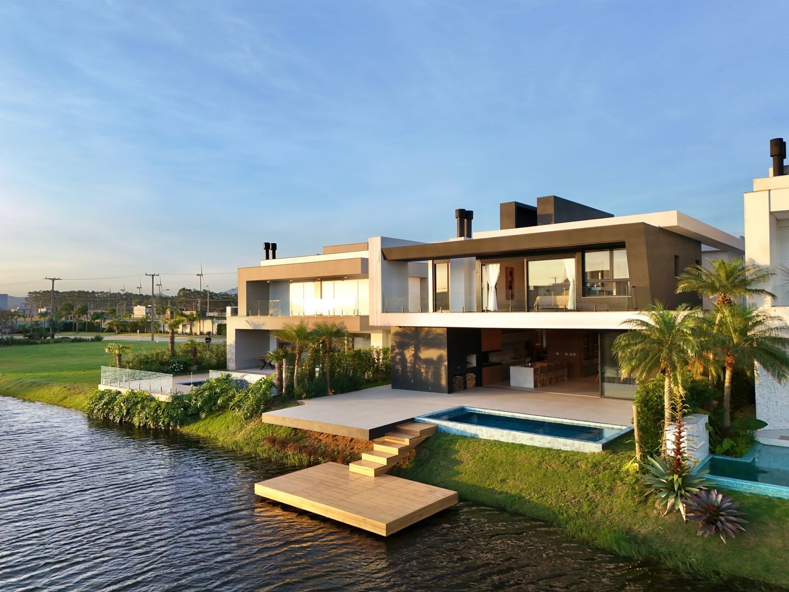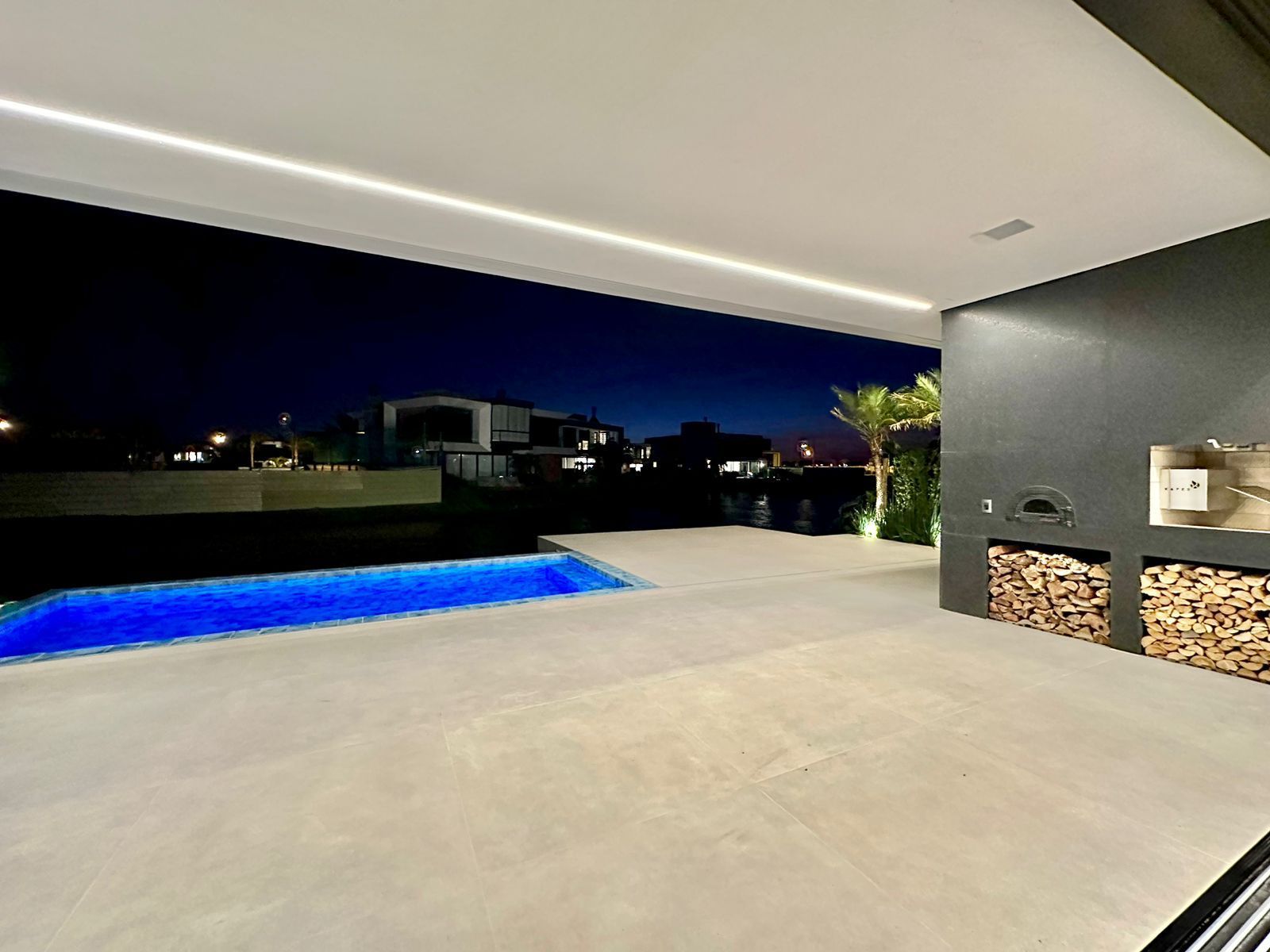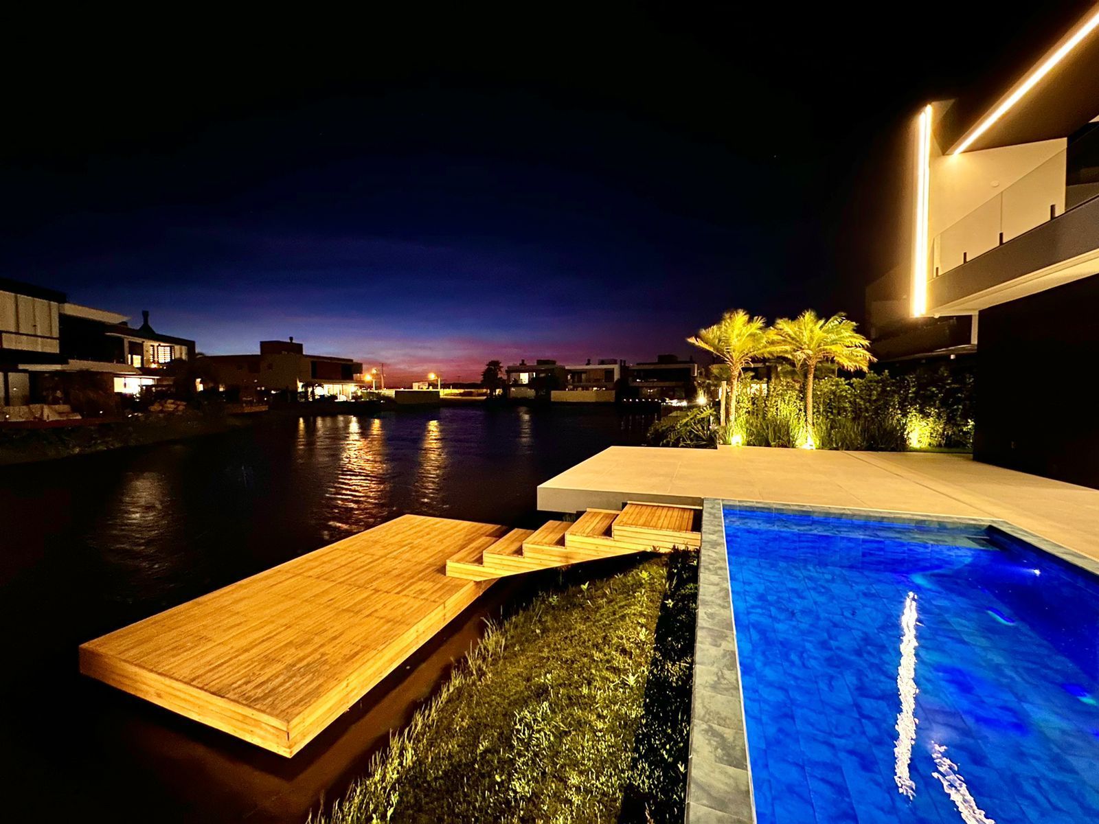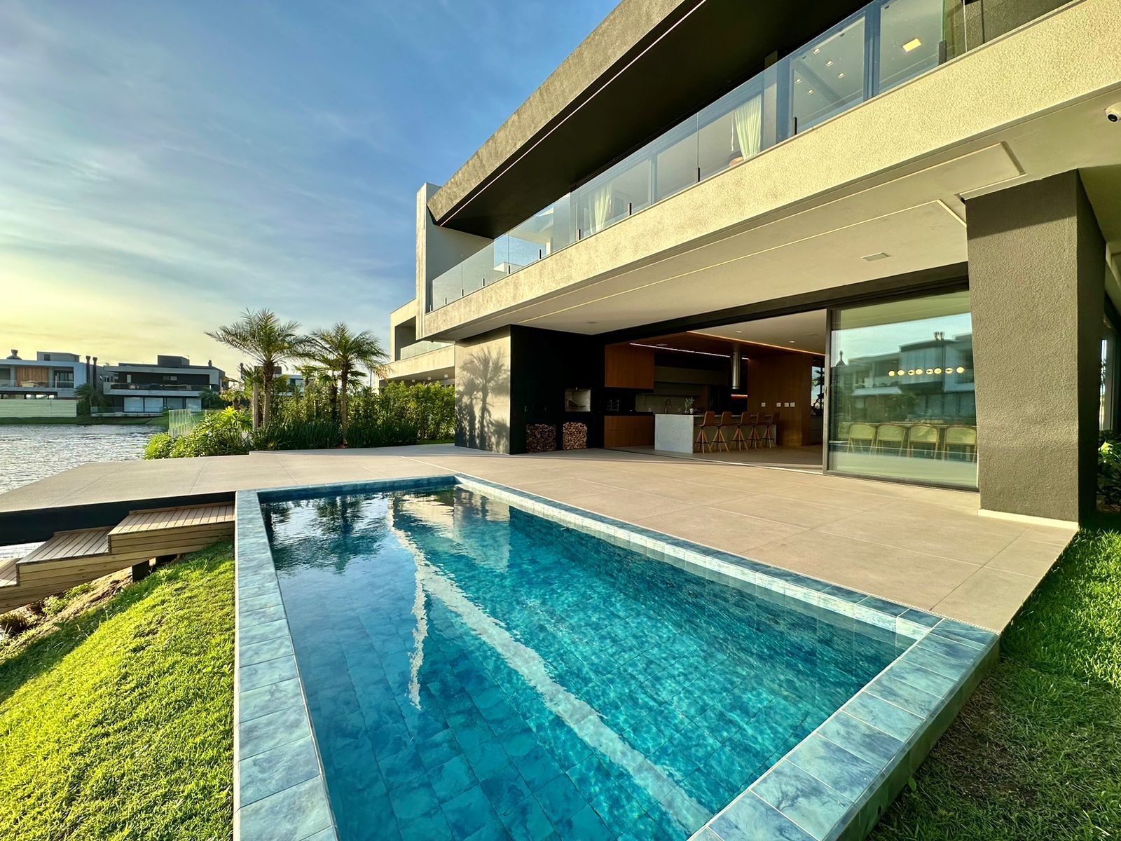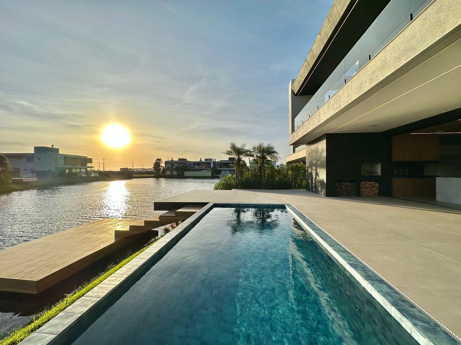 SOBRADO À VENDA BEIRA LAGO ——— Sobrado com 467 M² Lote com M² 06 Suítes sendo 01 térrea Lavabo Beira Lago Piscina de concreto Deck junto ao lago Automatizado Mobiliado Muita Iluminação natural Lareira Churrasqueira Living integrado Aberturas em PVC Piso Aquecido nos Banheiros