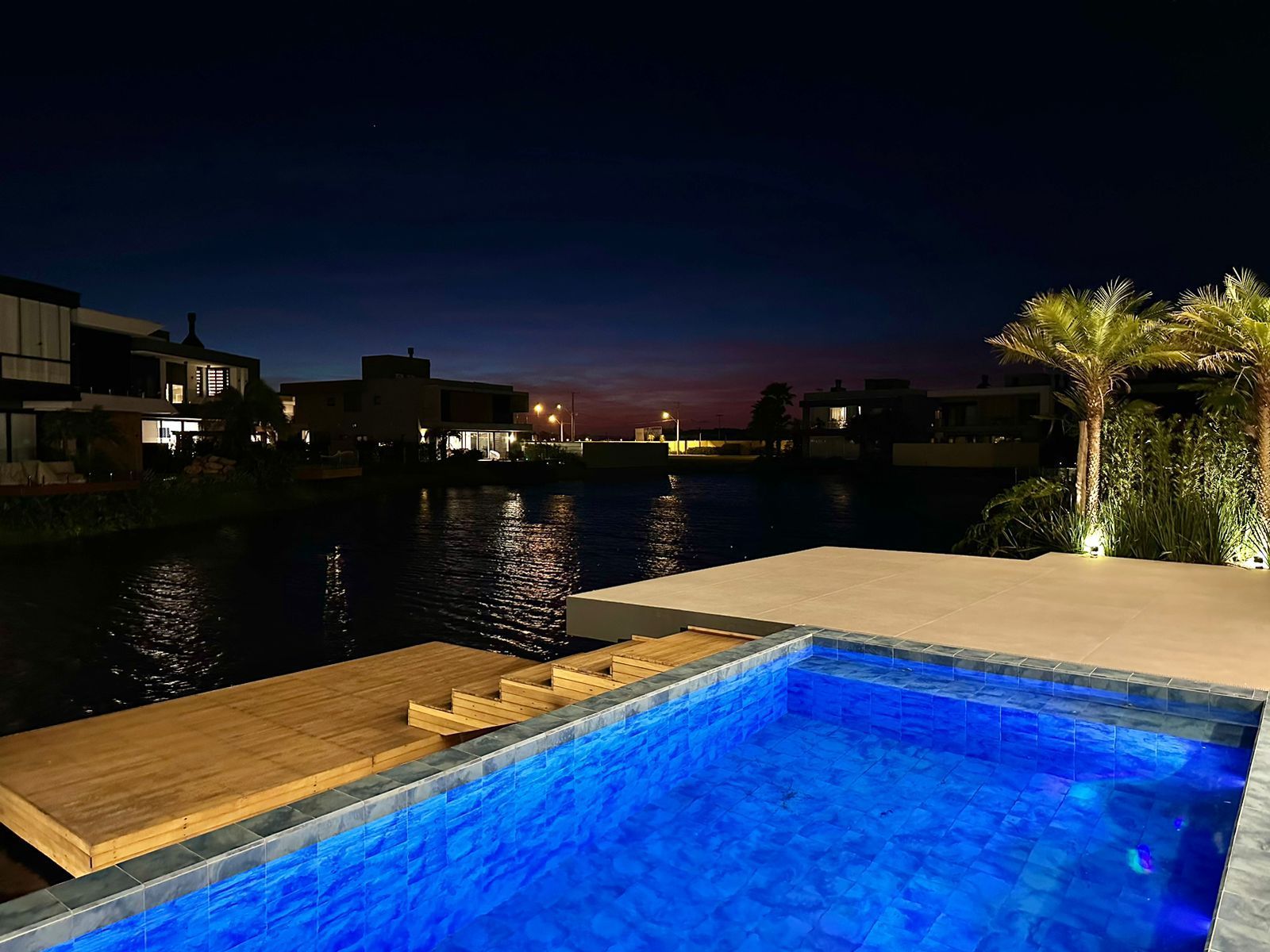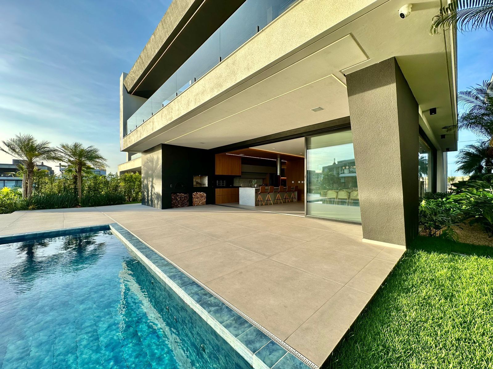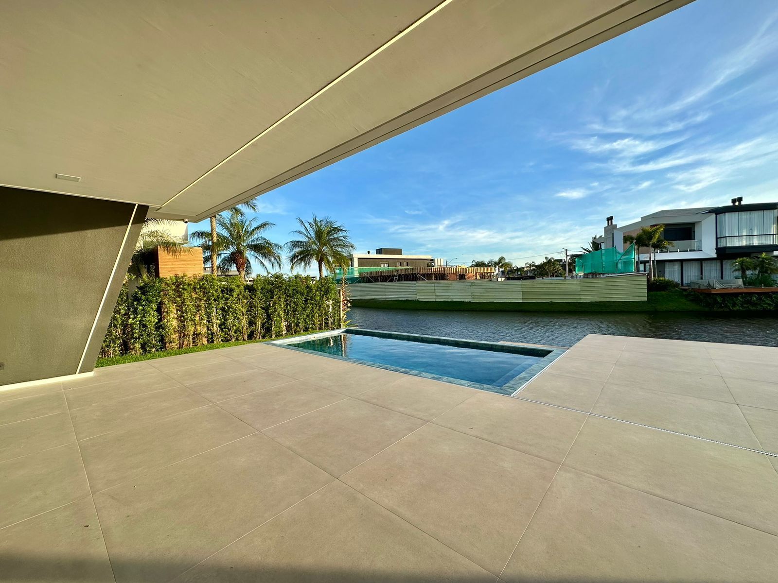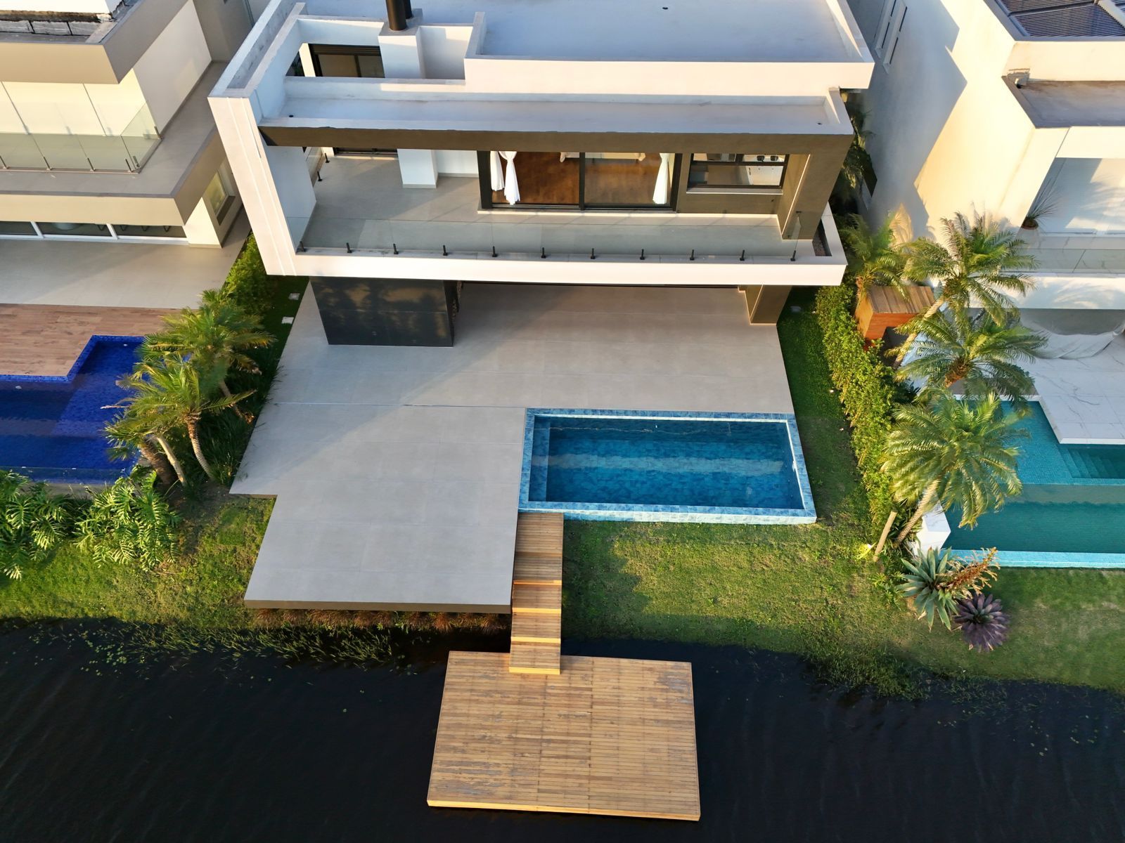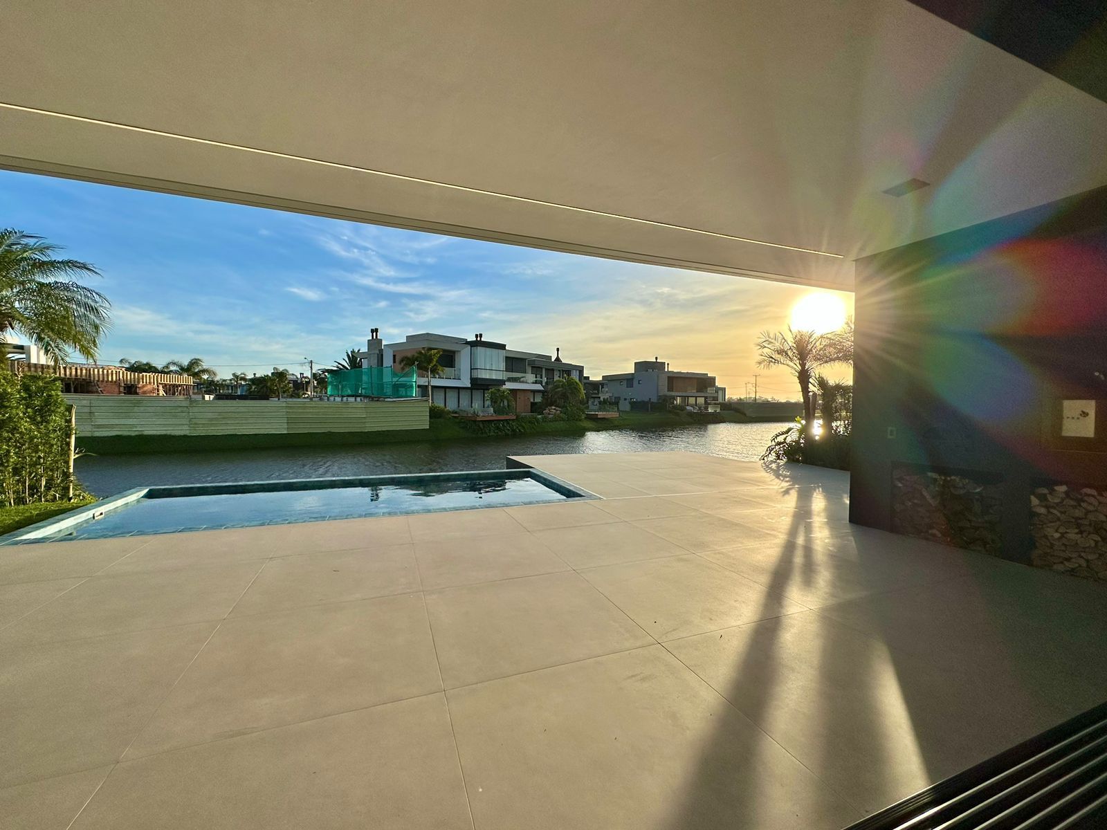 SOBRADO À VENDA BEIRA LAGO ——— Sobrado com 467 M² Lote com M² 06 Suítes sendo 01 térrea Lavabo Beira Lago Piscina de concreto Deck junto ao lago Automatizado Mobiliado Muita Iluminação natural Lareira Churrasqueira Living integrado Aberturas em PVC Piso Aquecido nos Banheiros