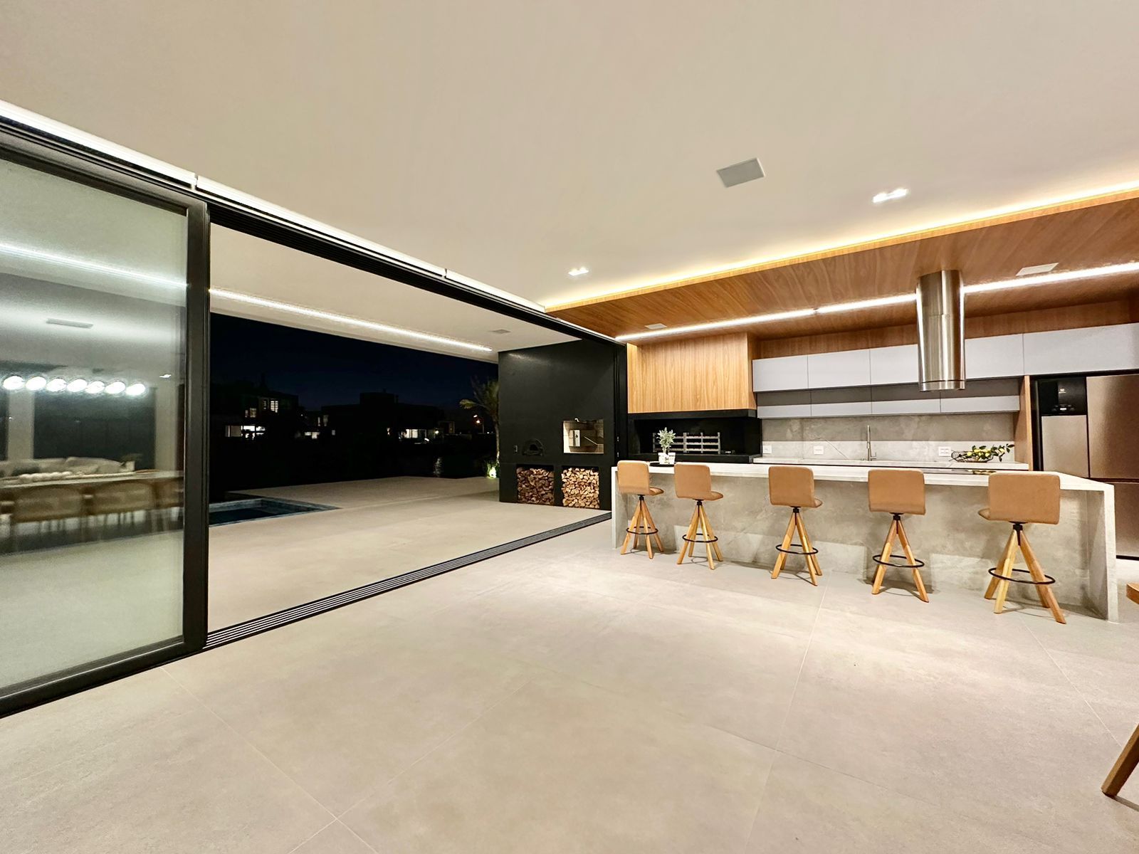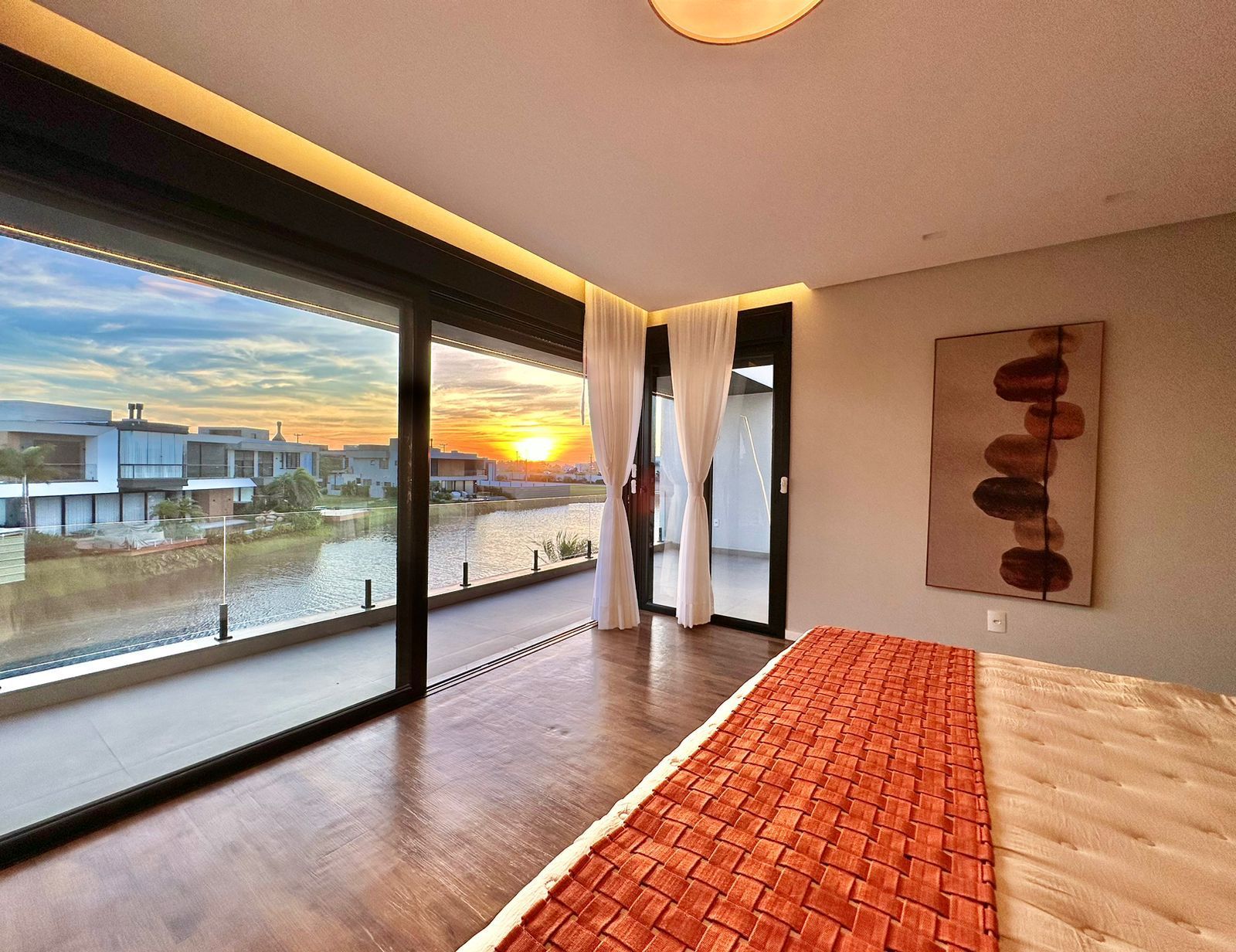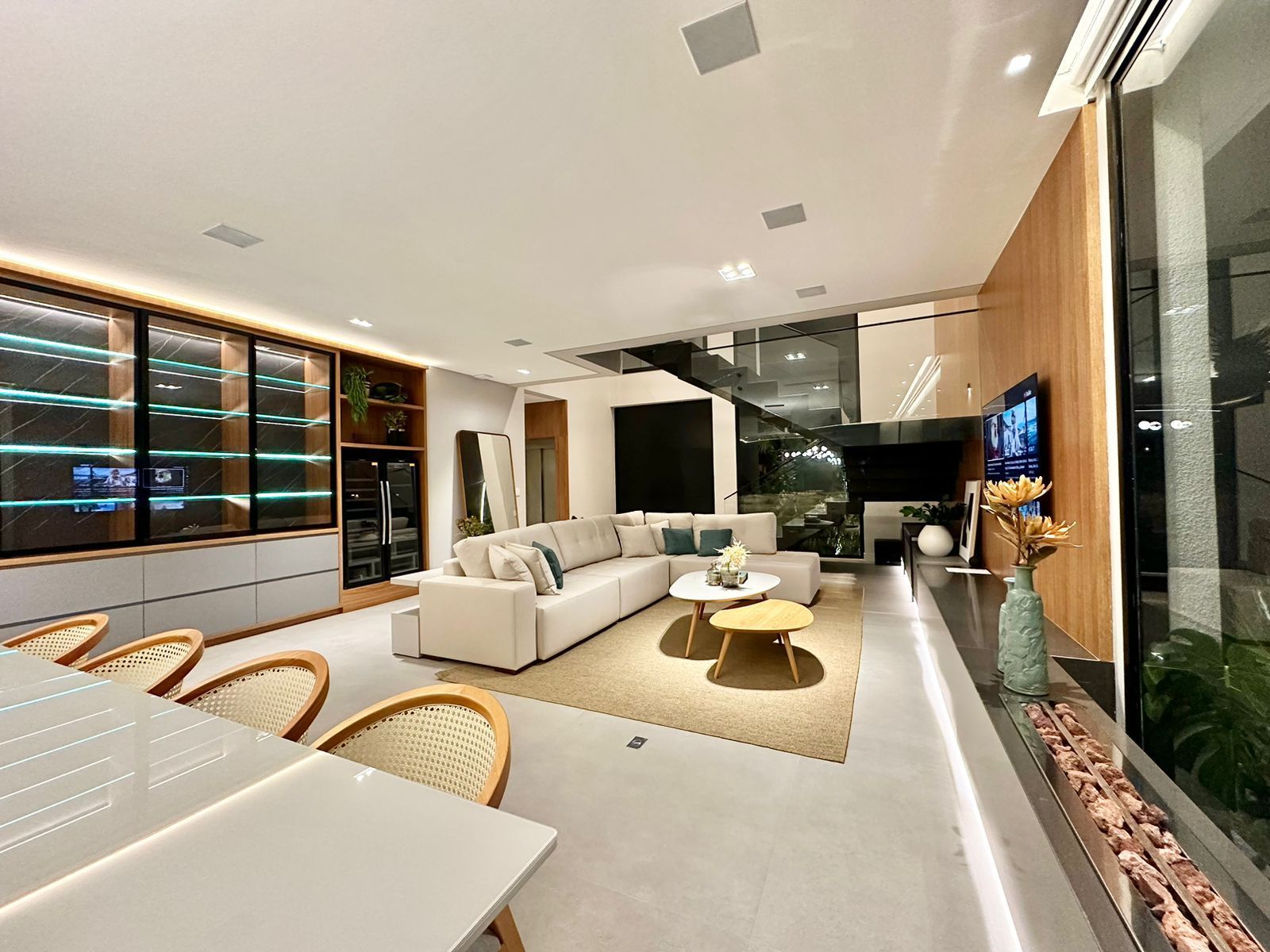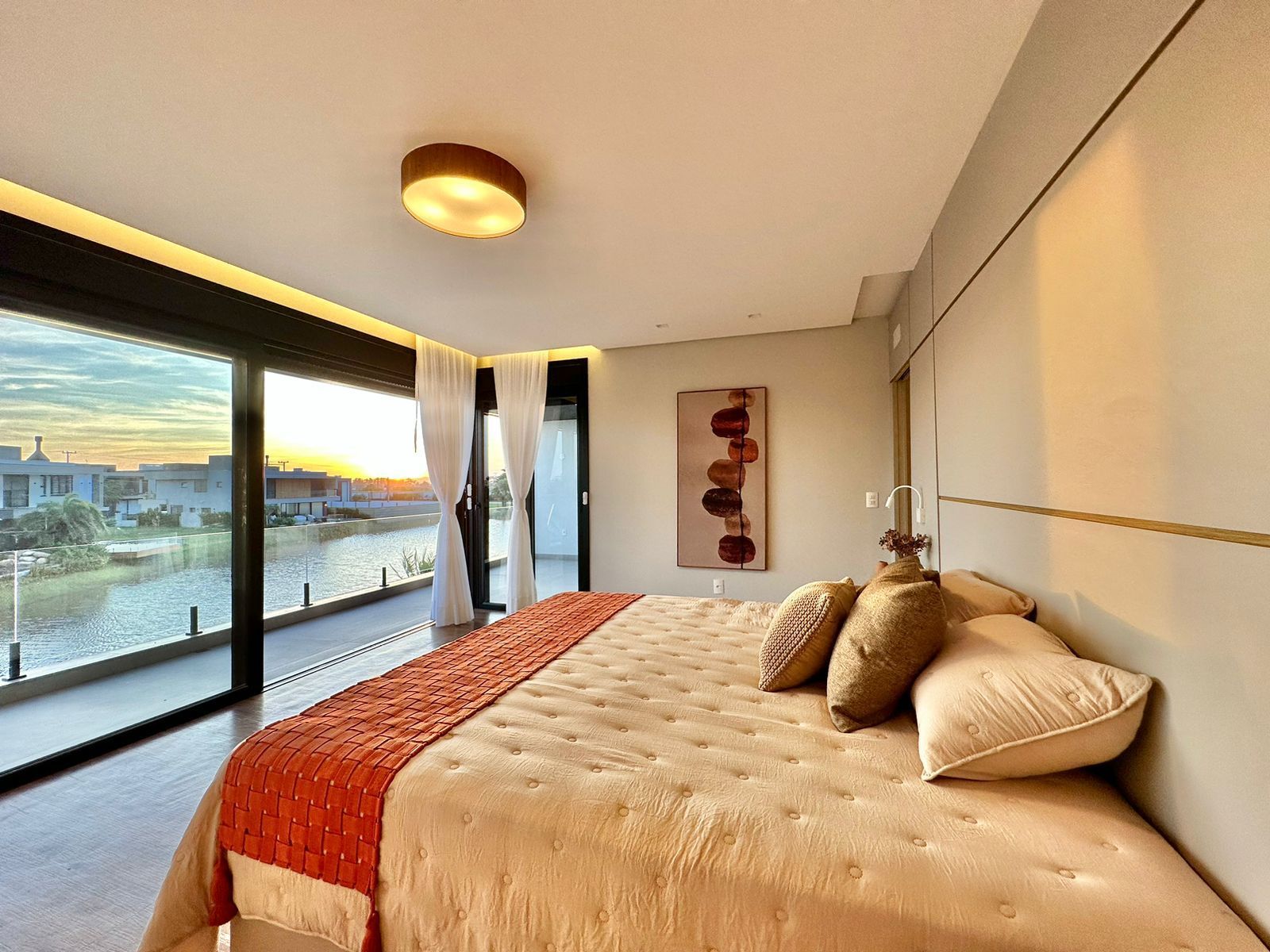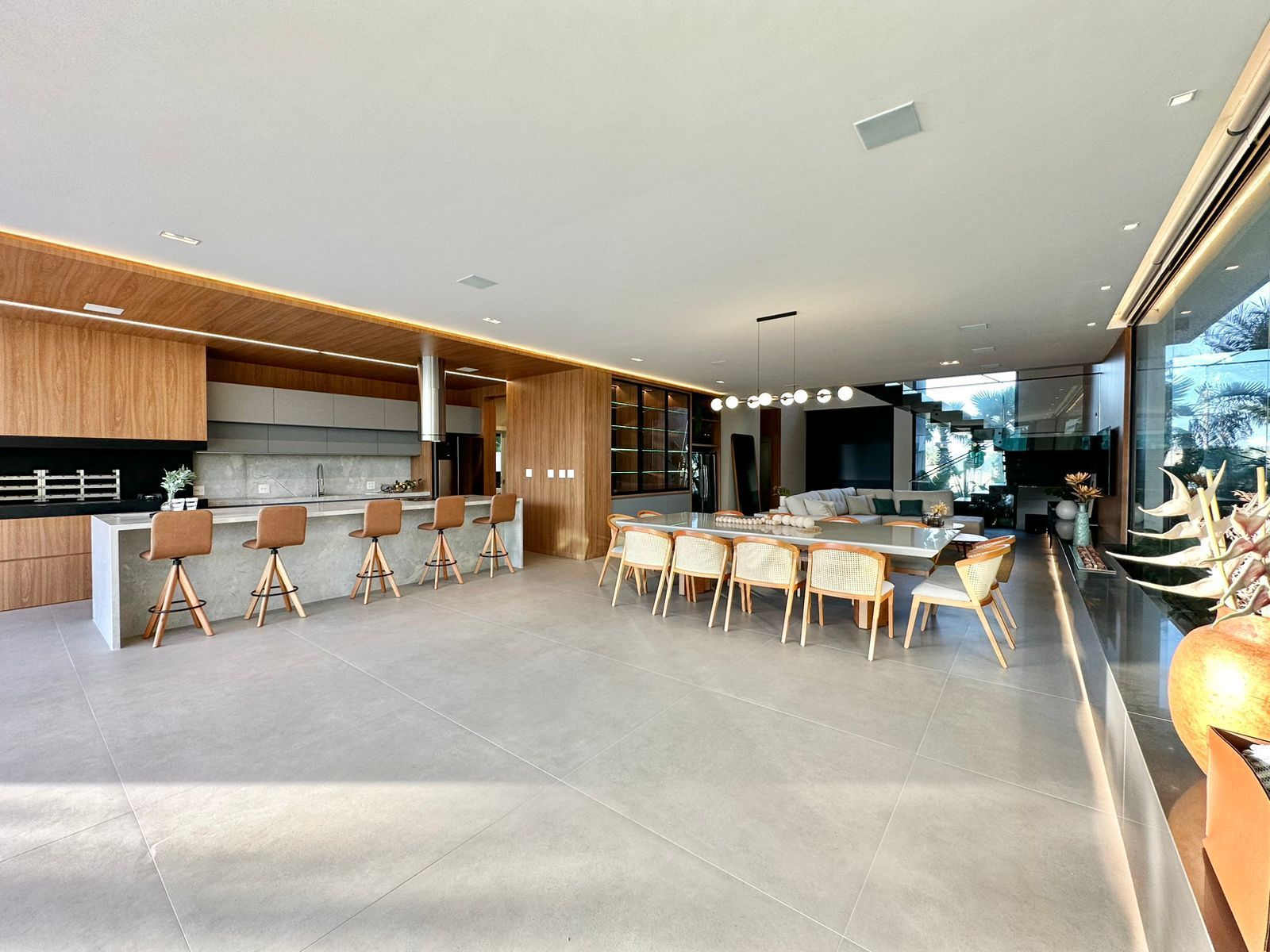 SOBRADO À VENDA BEIRA LAGO ——— Sobrado com 467 M² Lote com M² 06 Suítes sendo 01 térrea Lavabo Beira Lago Piscina de concreto Deck junto ao lago Automatizado Mobiliado Muita Iluminação natural Lareira Churrasqueira Living integrado Aberturas em PVC Piso Aquecido nos Banheiros