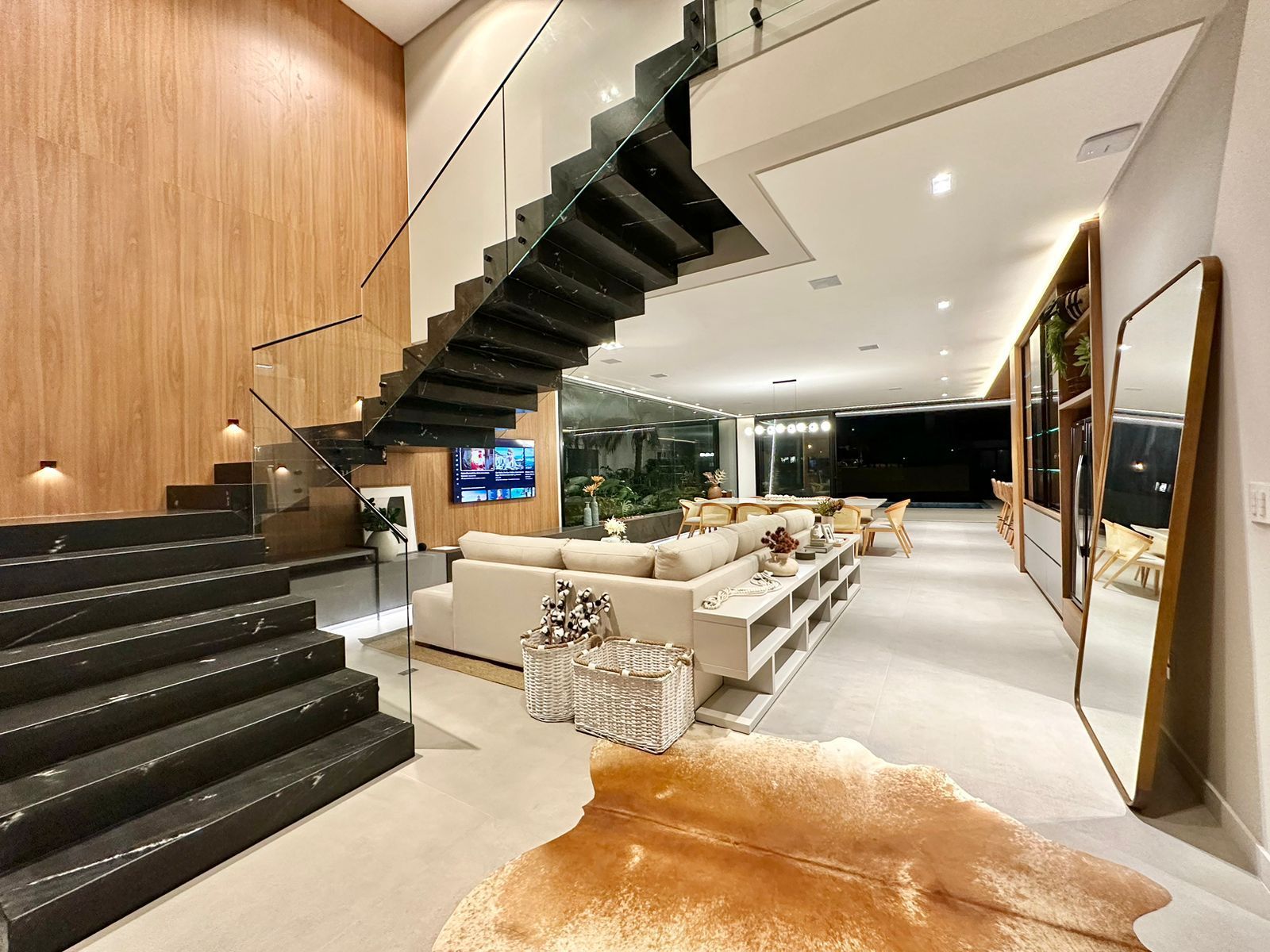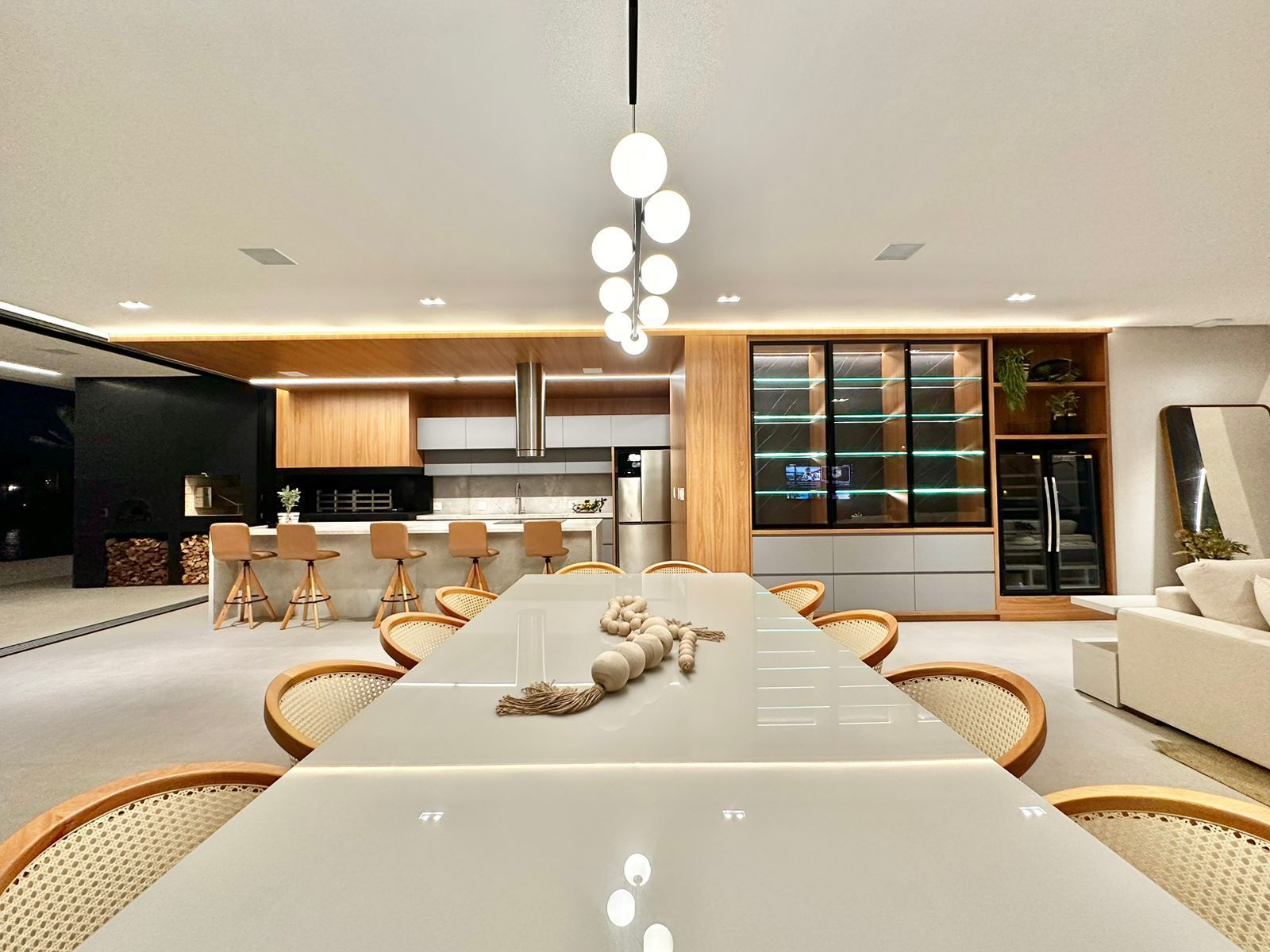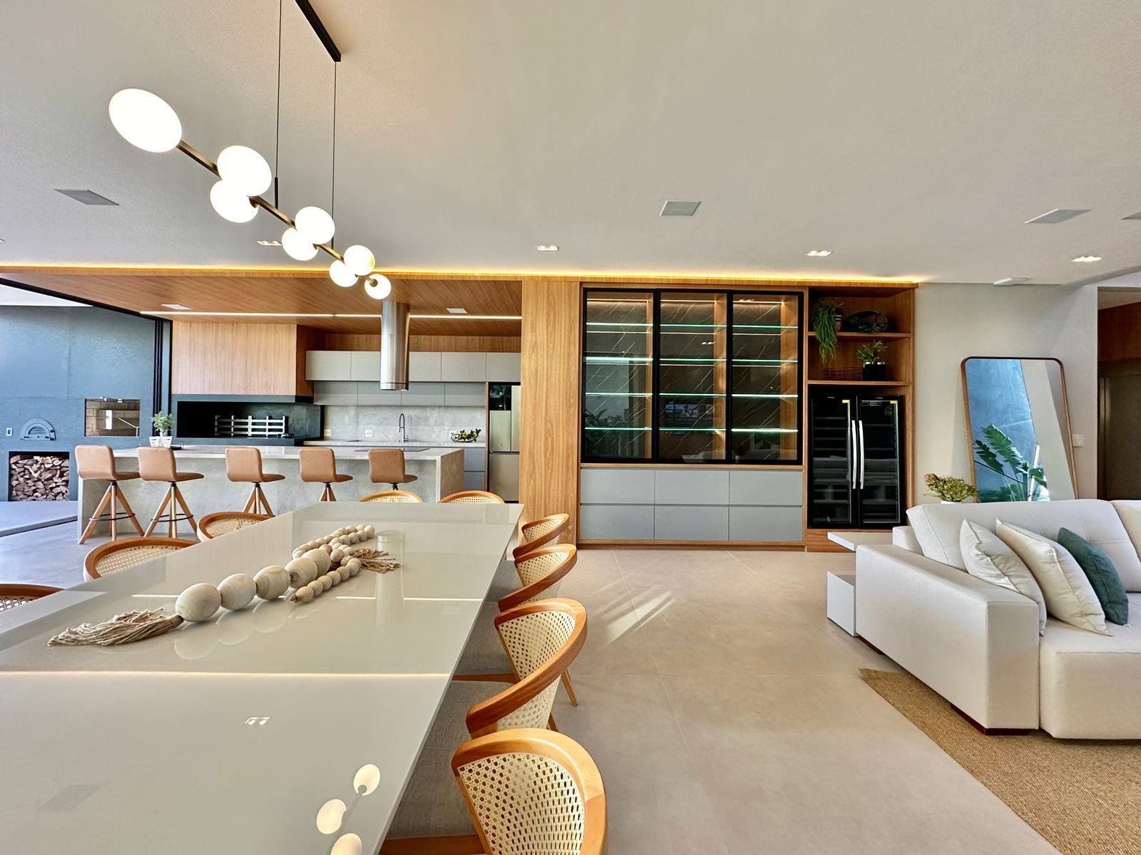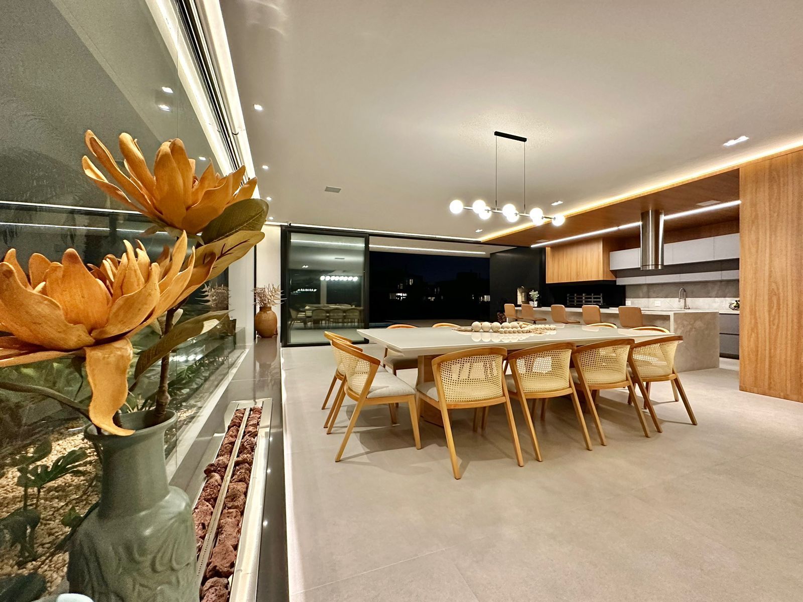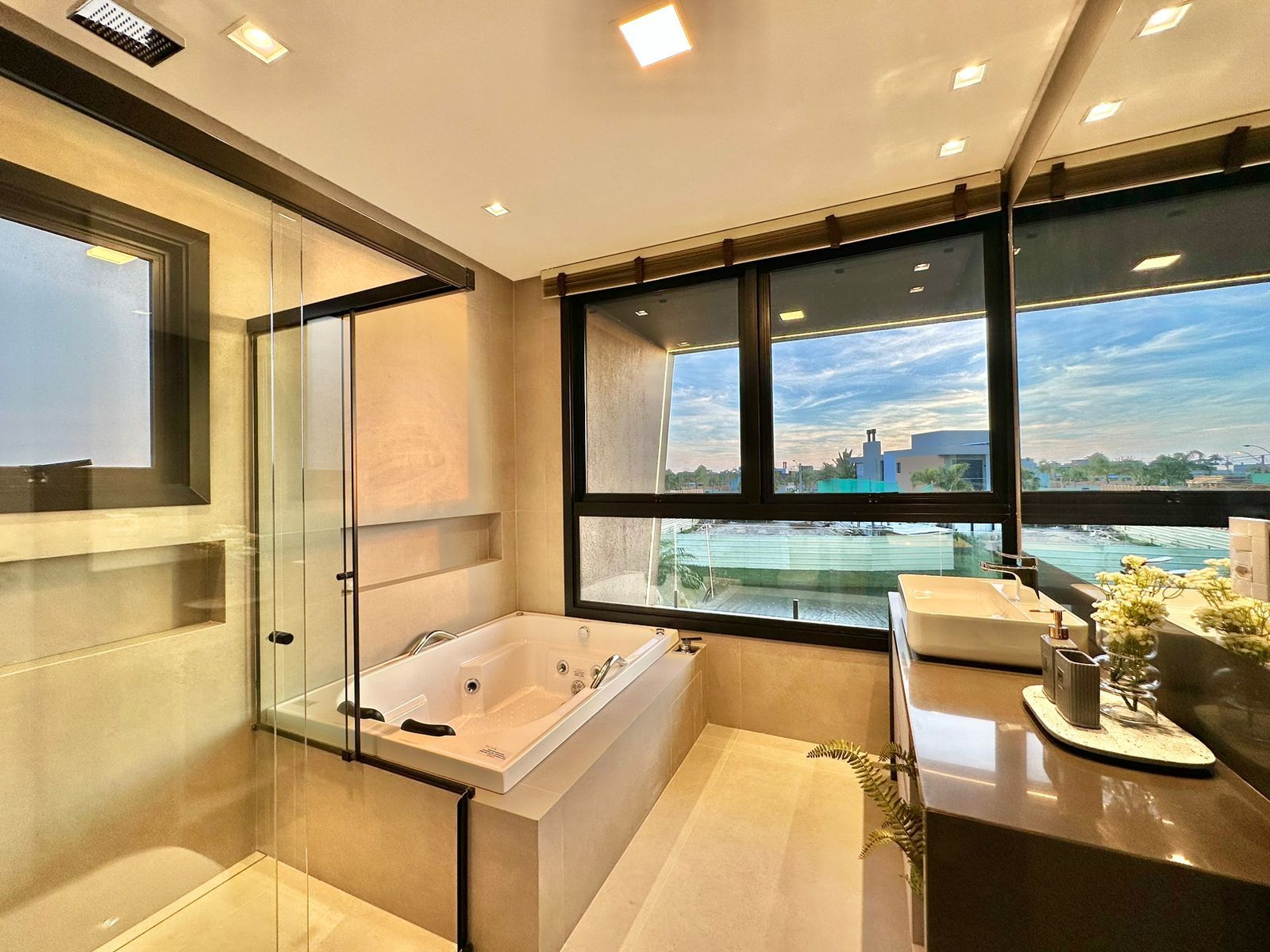 SOBRADO À VENDA BEIRA LAGO ——— Sobrado com 467 M² Lote com M² 06 Suítes sendo 01 térrea Lavabo Beira Lago Piscina de concreto Deck junto ao lago Automatizado Mobiliado Muita Iluminação natural Lareira Churrasqueira Living integrado Aberturas em PVC Piso Aquecido nos Banheiros