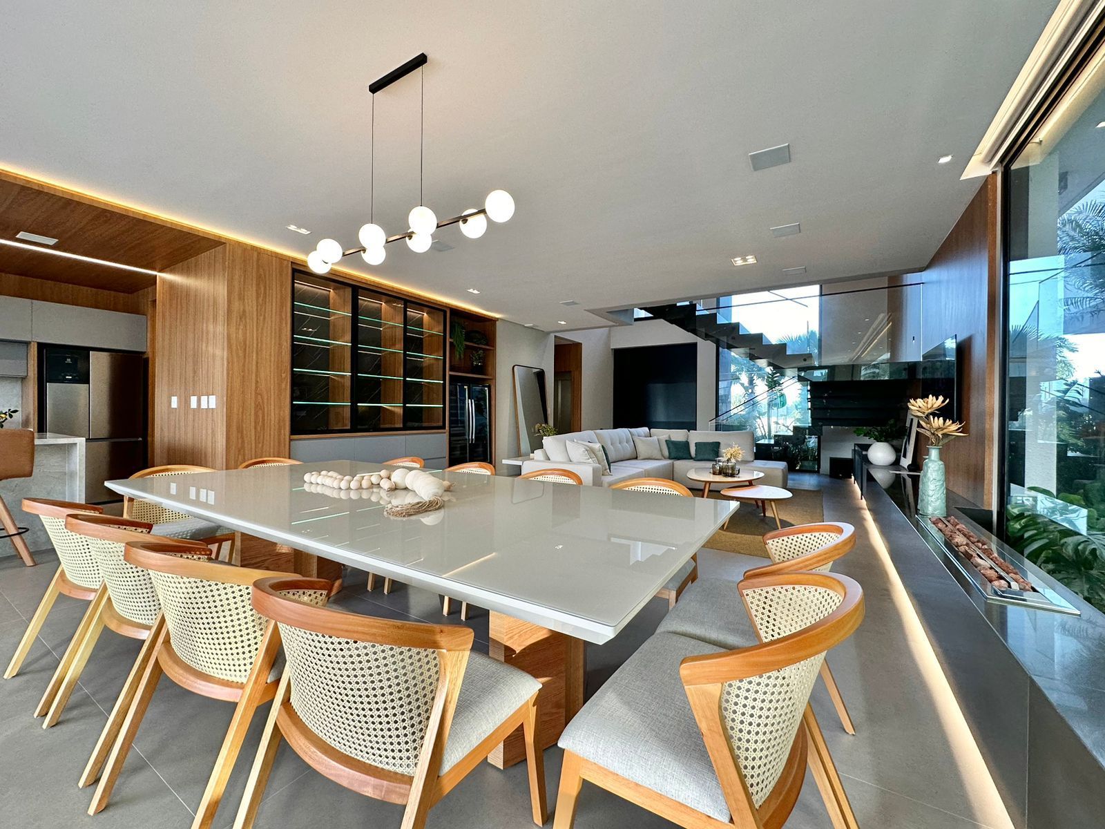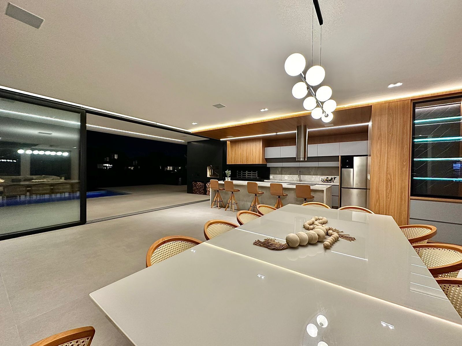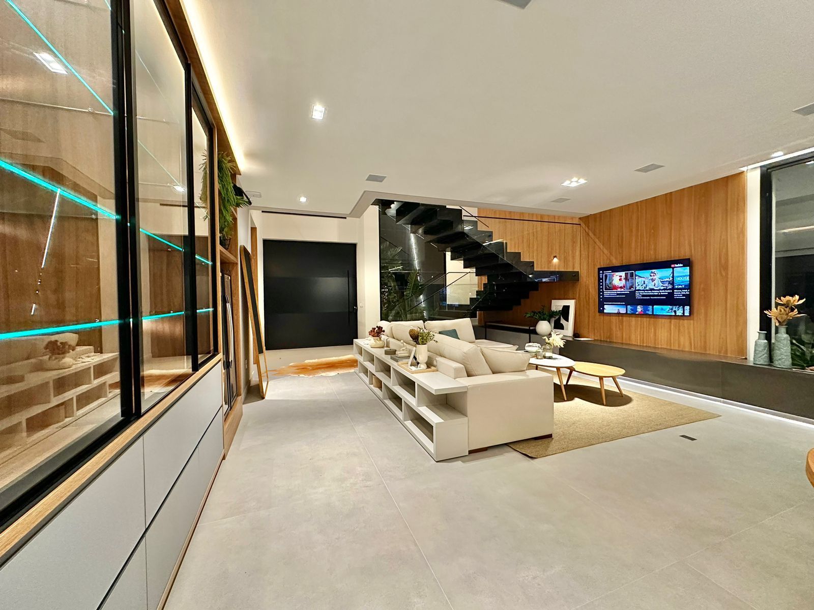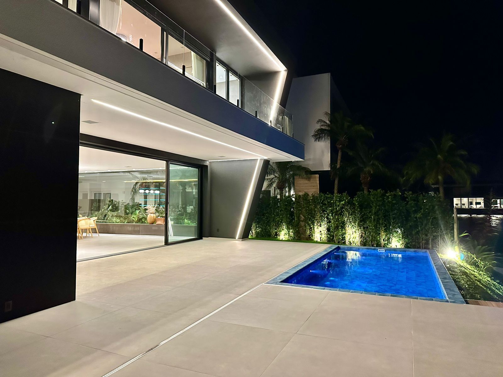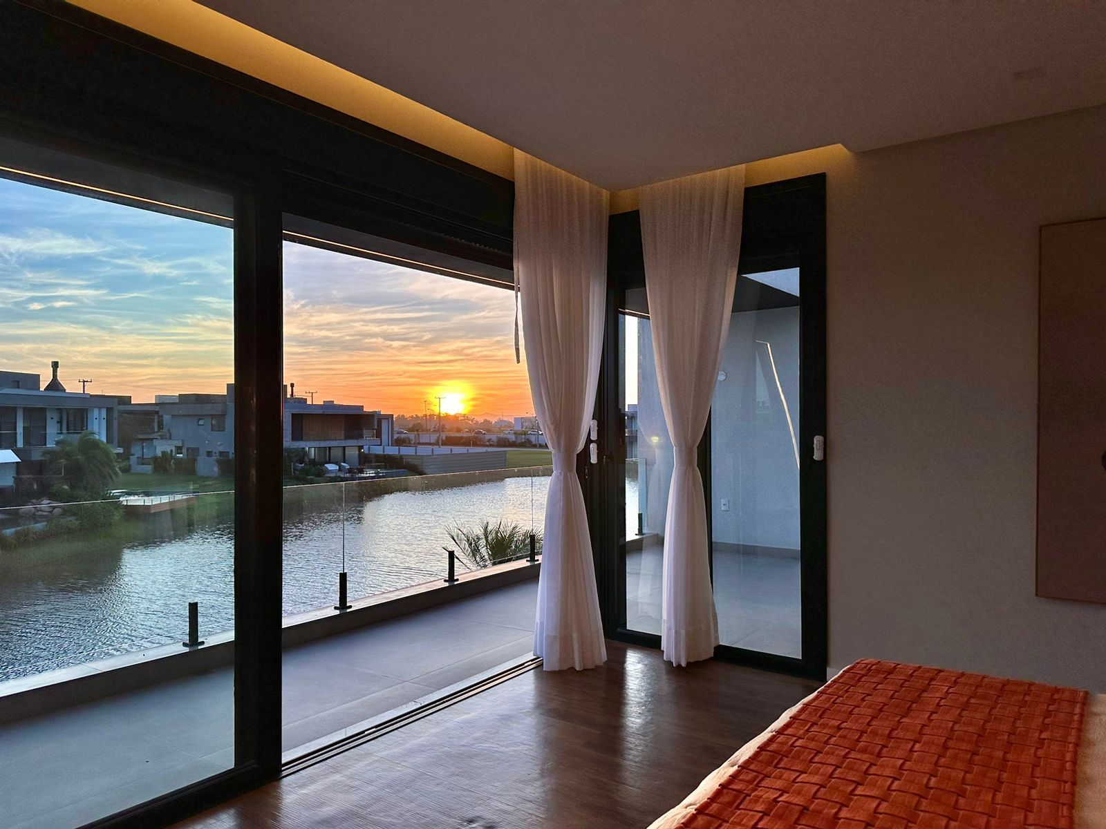 SOBRADO À VENDA BEIRA LAGO ——— Sobrado com 467 M² Lote com M² 06 Suítes sendo 01 térrea Lavabo Beira Lago Piscina de concreto Deck junto ao lago Automatizado Mobiliado Muita Iluminação natural Lareira Churrasqueira Living integrado Aberturas em PVC Piso Aquecido nos Banheiros
