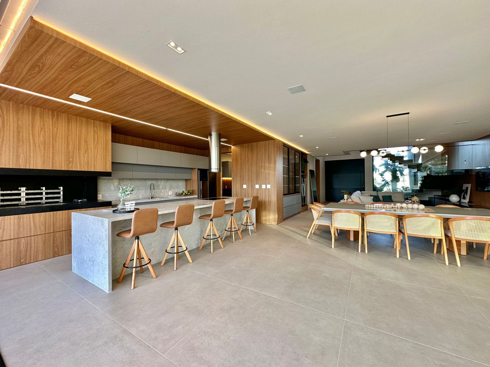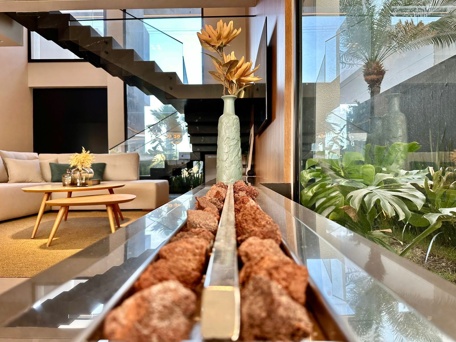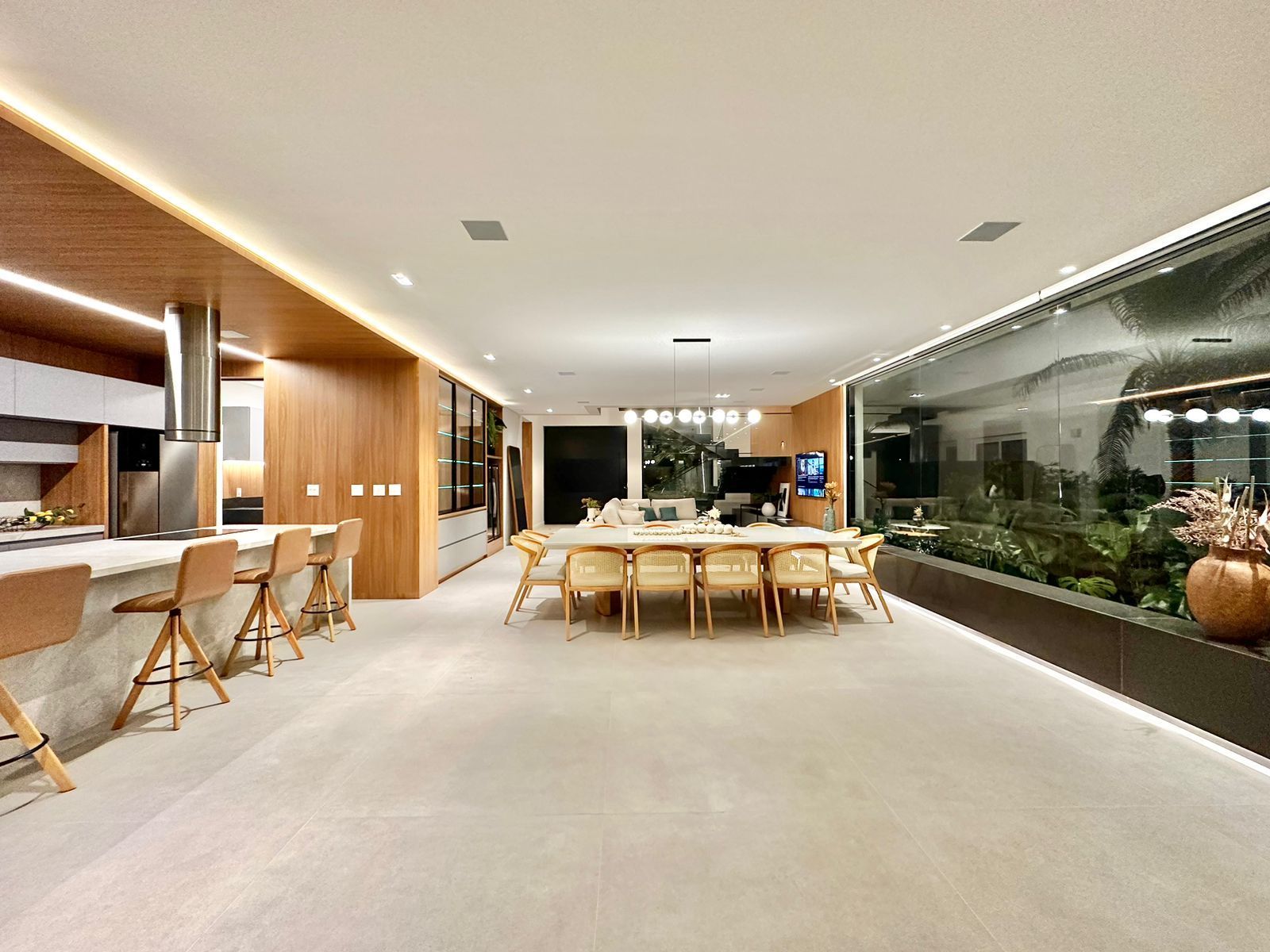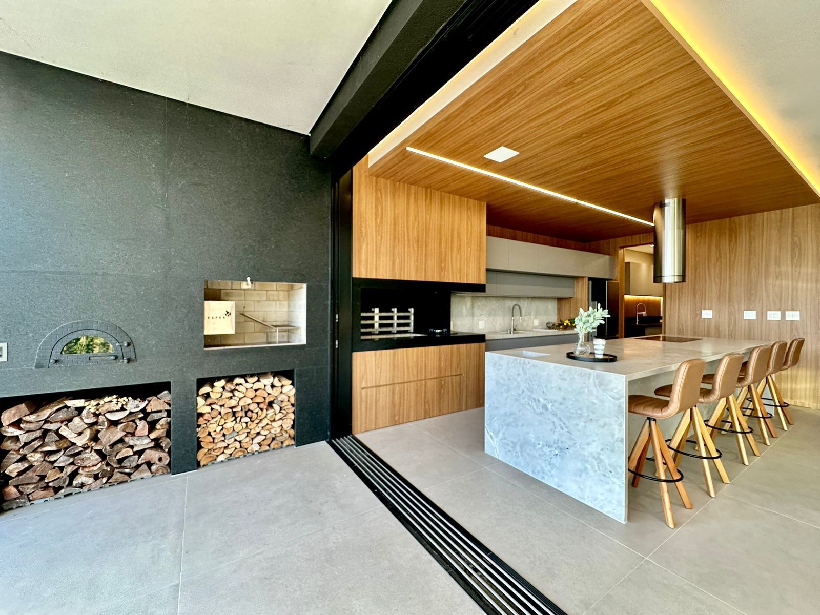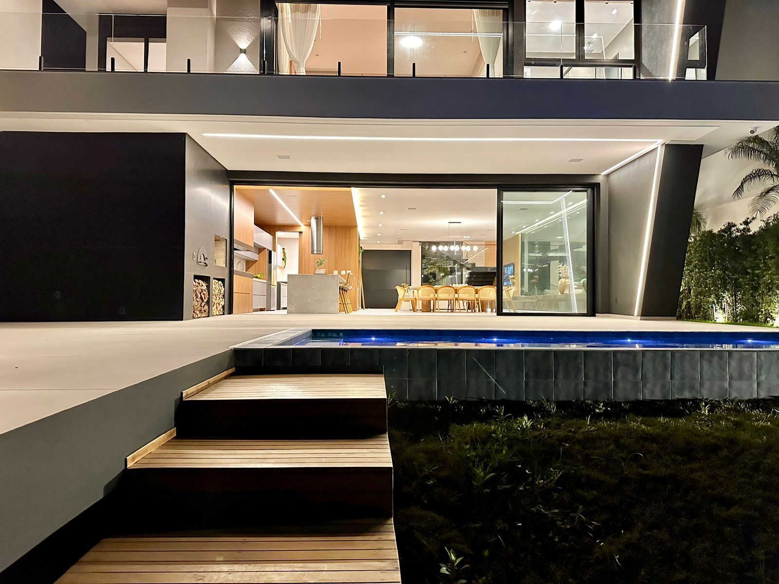 SOBRADO À VENDA BEIRA LAGO ——— Sobrado com 467 M² Lote com M² 06 Suítes sendo 01 térrea Lavabo Beira Lago Piscina de concreto Deck junto ao lago Automatizado Mobiliado Muita Iluminação natural Lareira Churrasqueira Living integrado Aberturas em PVC Piso Aquecido nos Banheiros