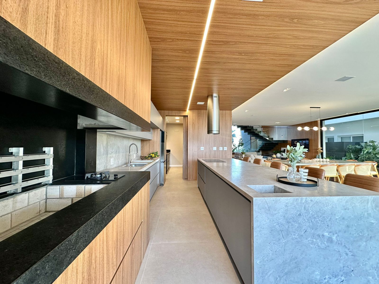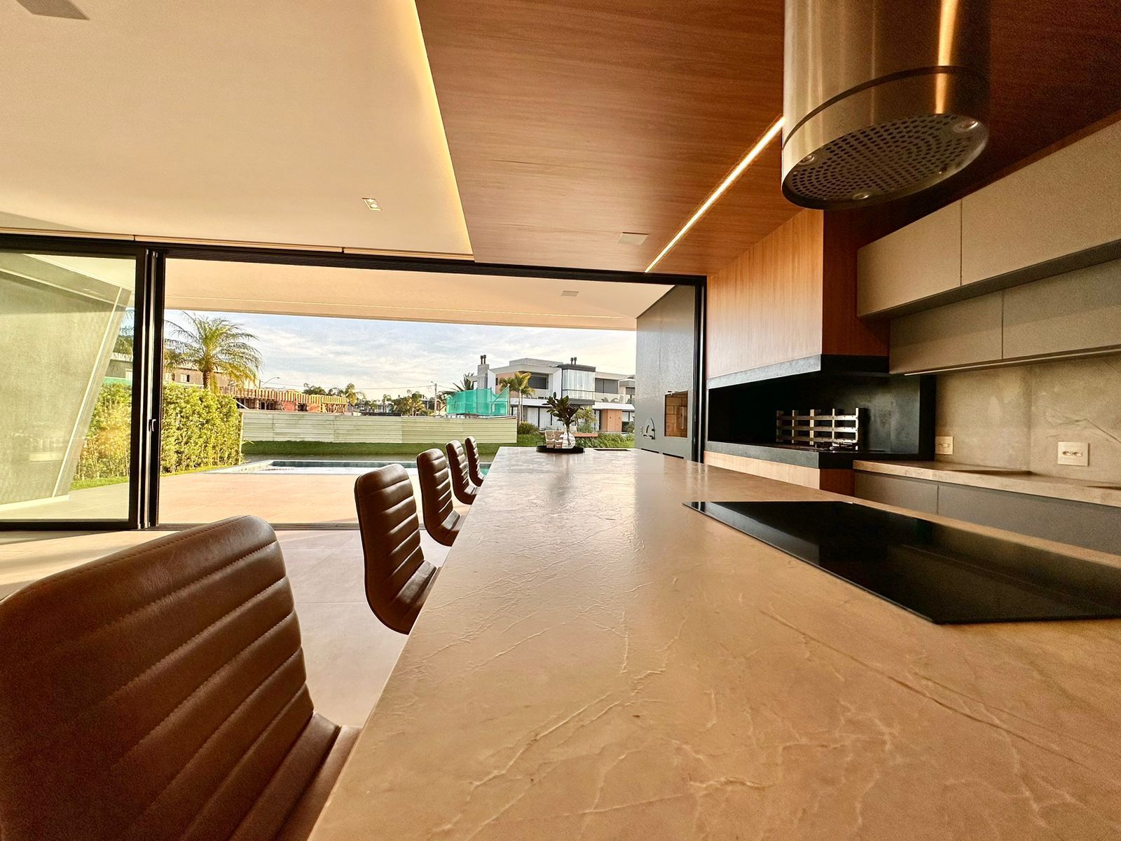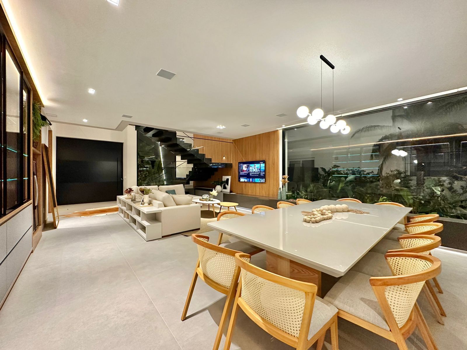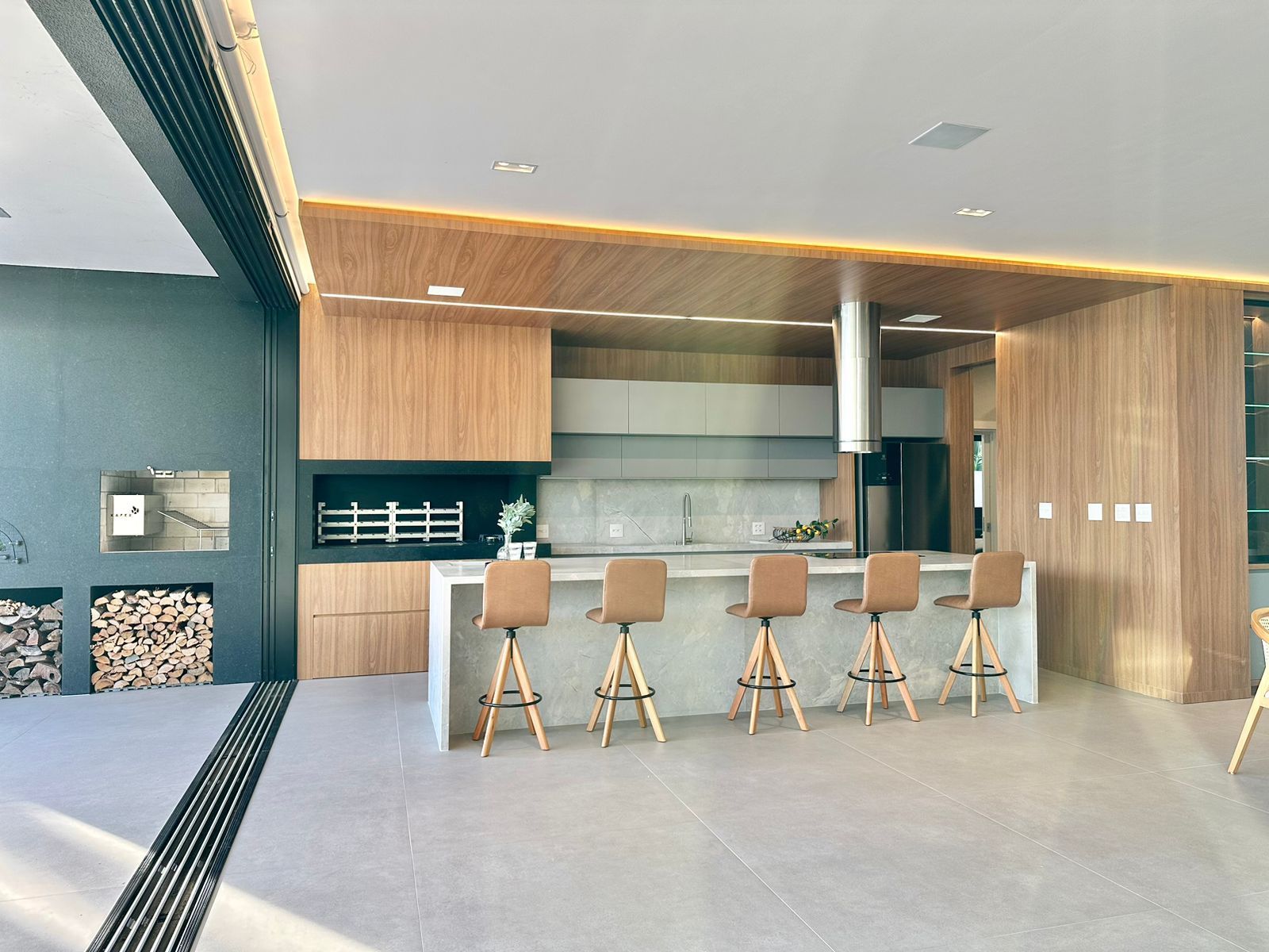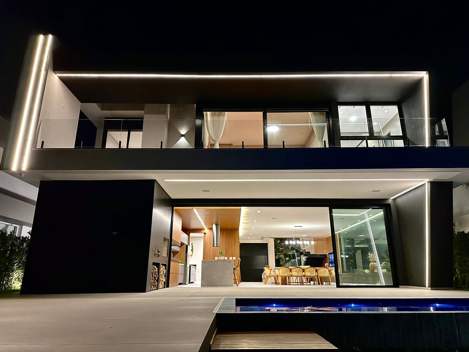 SOBRADO À VENDA BEIRA LAGO ——— Sobrado com 467 M² Lote com M² 06 Suítes sendo 01 térrea Lavabo Beira Lago Piscina de concreto Deck junto ao lago Automatizado Mobiliado Muita Iluminação natural Lareira Churrasqueira Living integrado Aberturas em PVC Piso Aquecido nos Banheiros