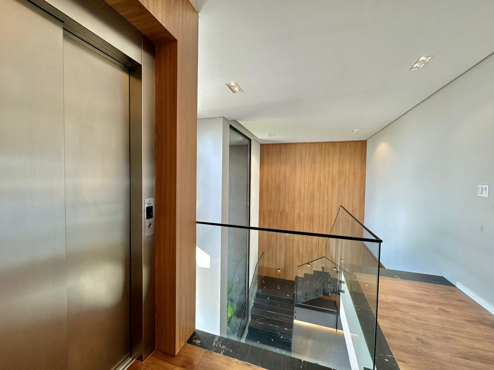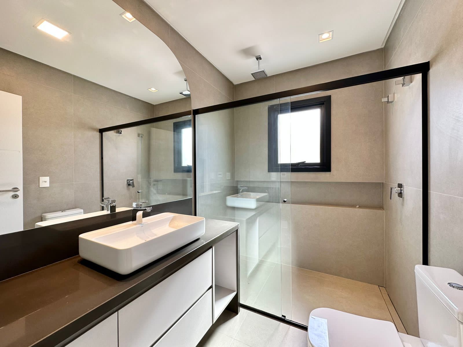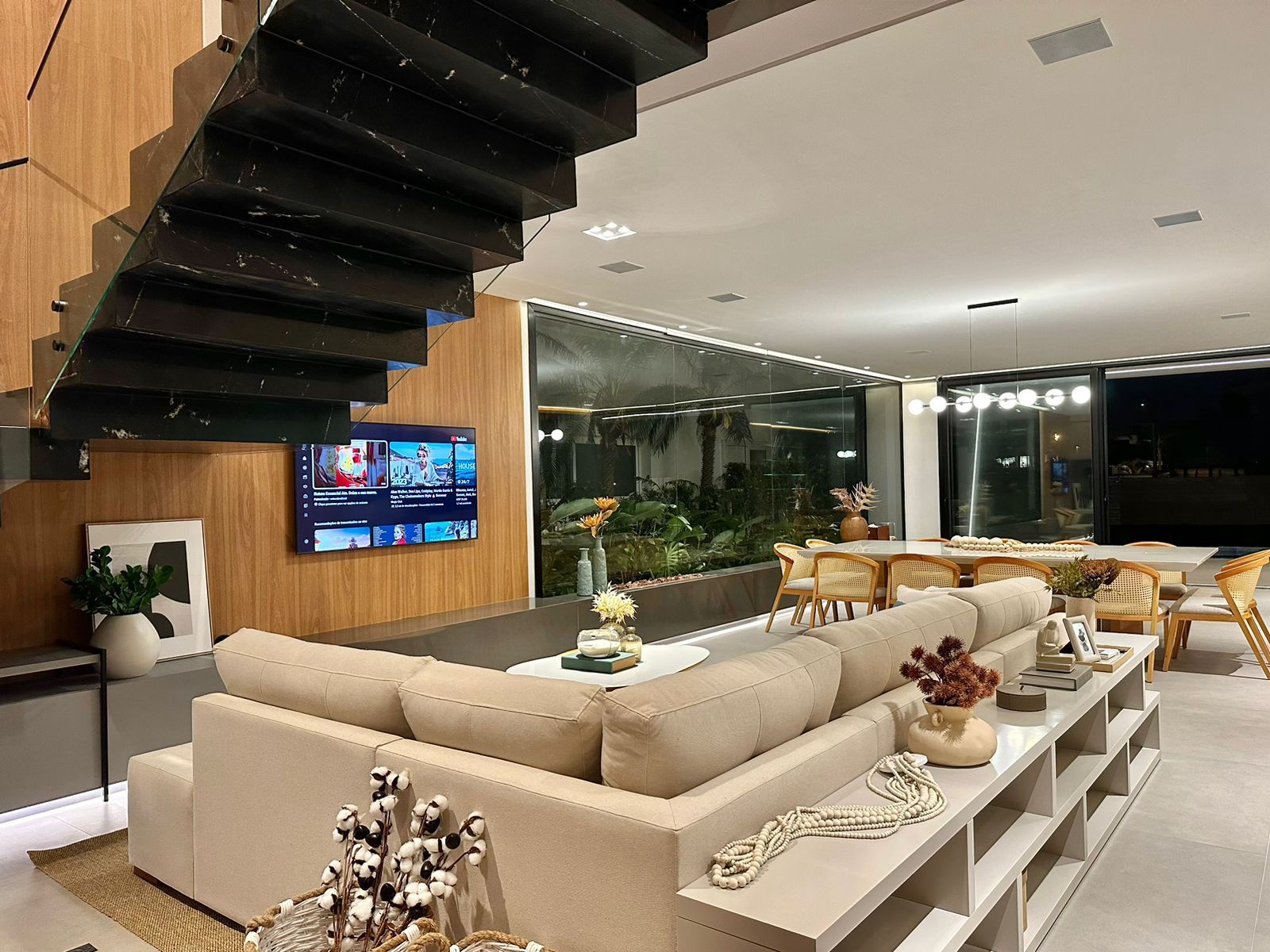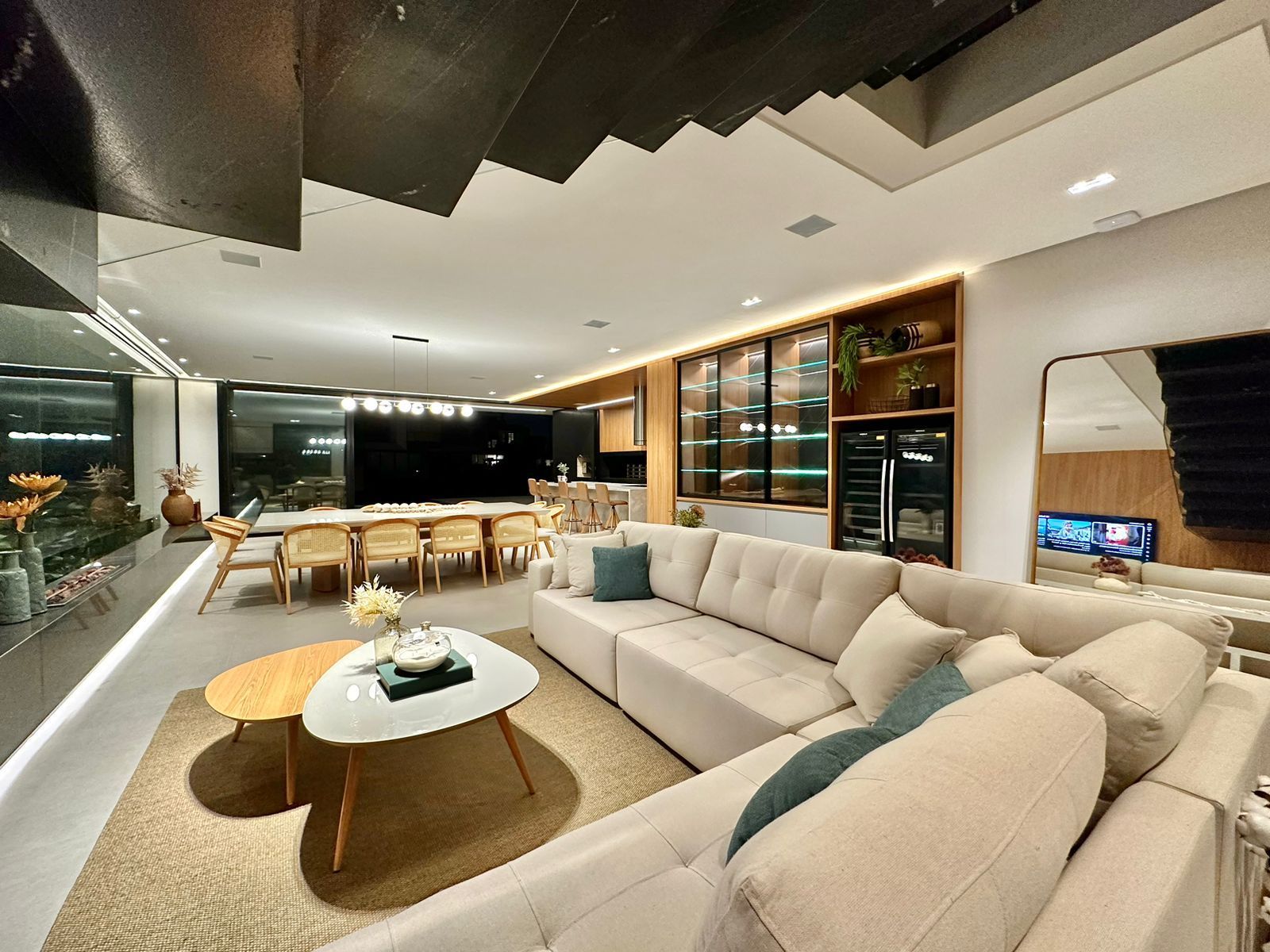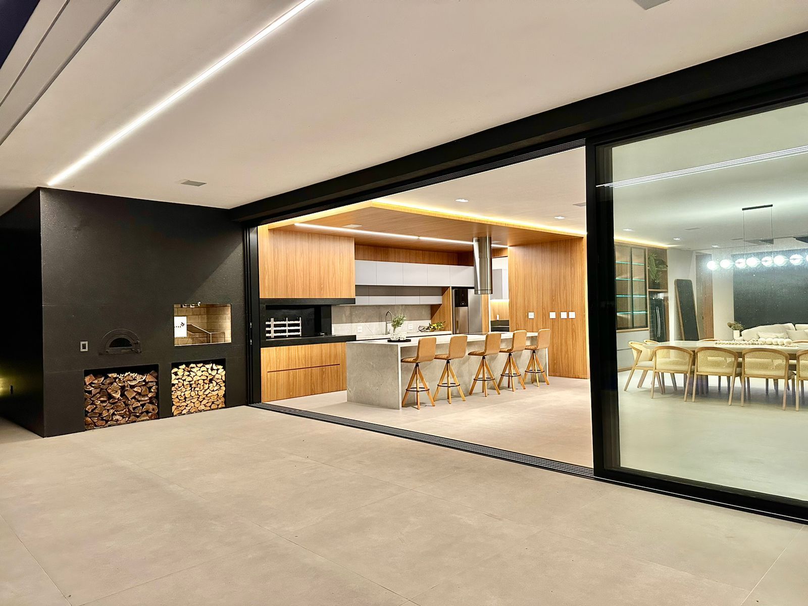 SOBRADO À VENDA BEIRA LAGO ——— Sobrado com 467 M² Lote com M² 06 Suítes sendo 01 térrea Lavabo Beira Lago Piscina de concreto Deck junto ao lago Automatizado Mobiliado Muita Iluminação natural Lareira Churrasqueira Living integrado Aberturas em PVC Piso Aquecido nos Banheiros