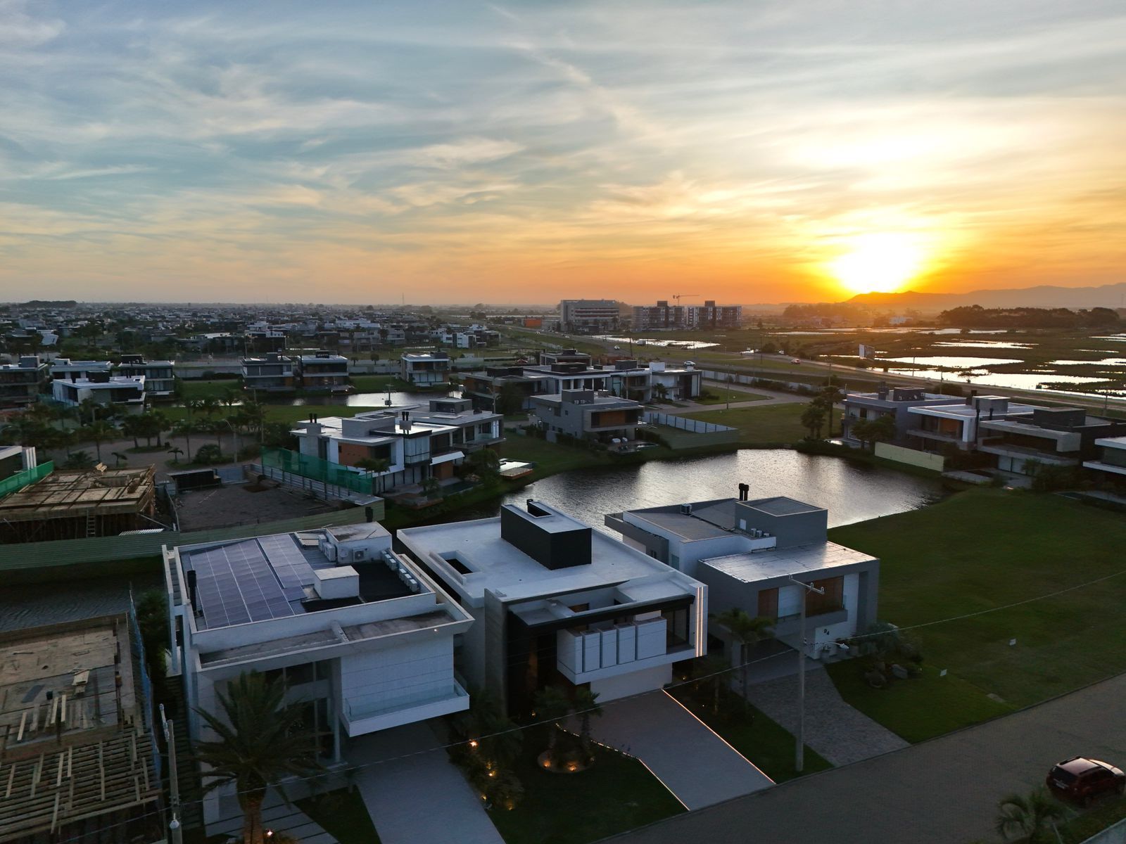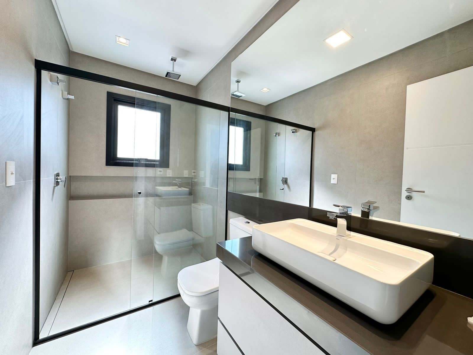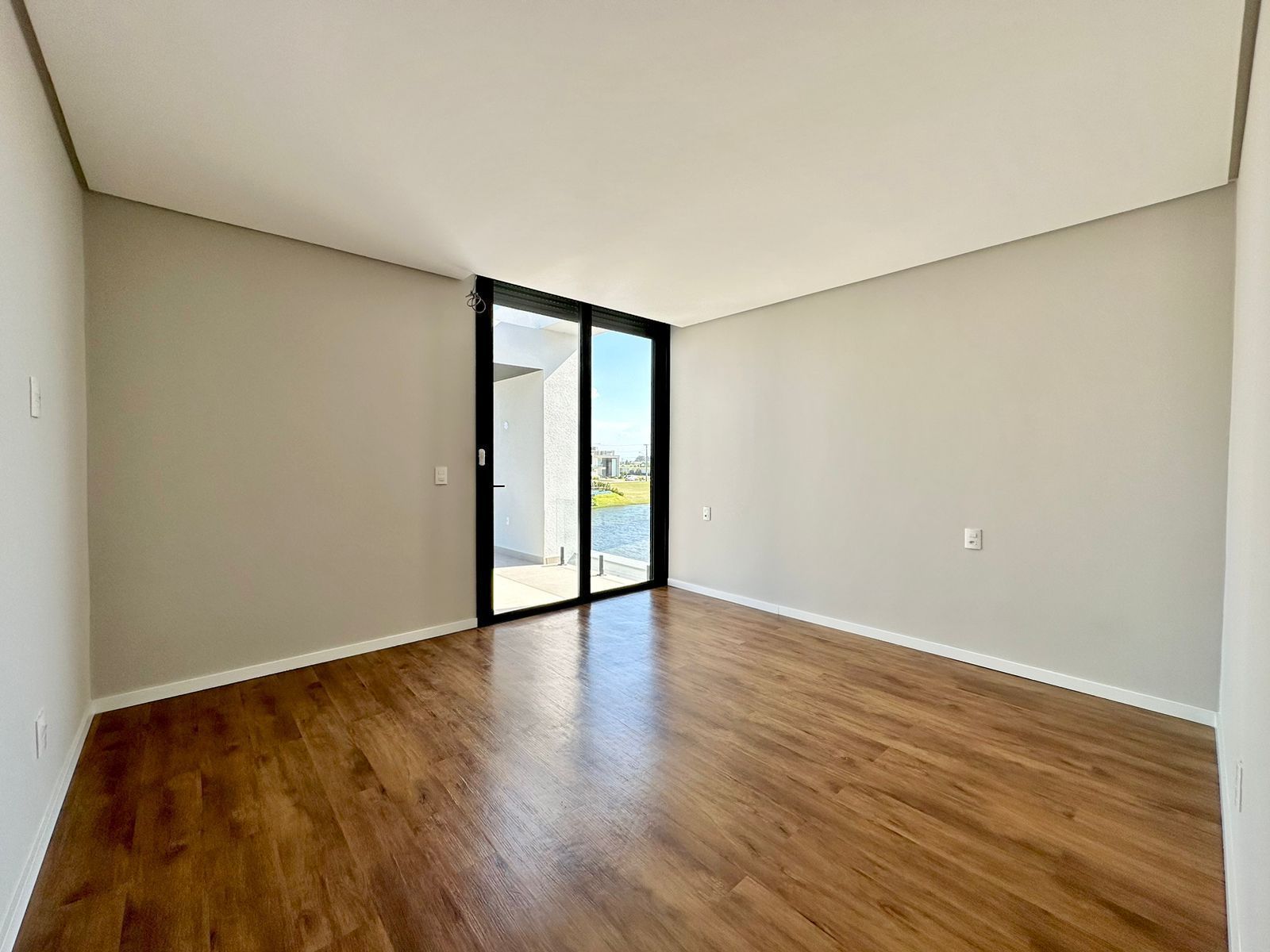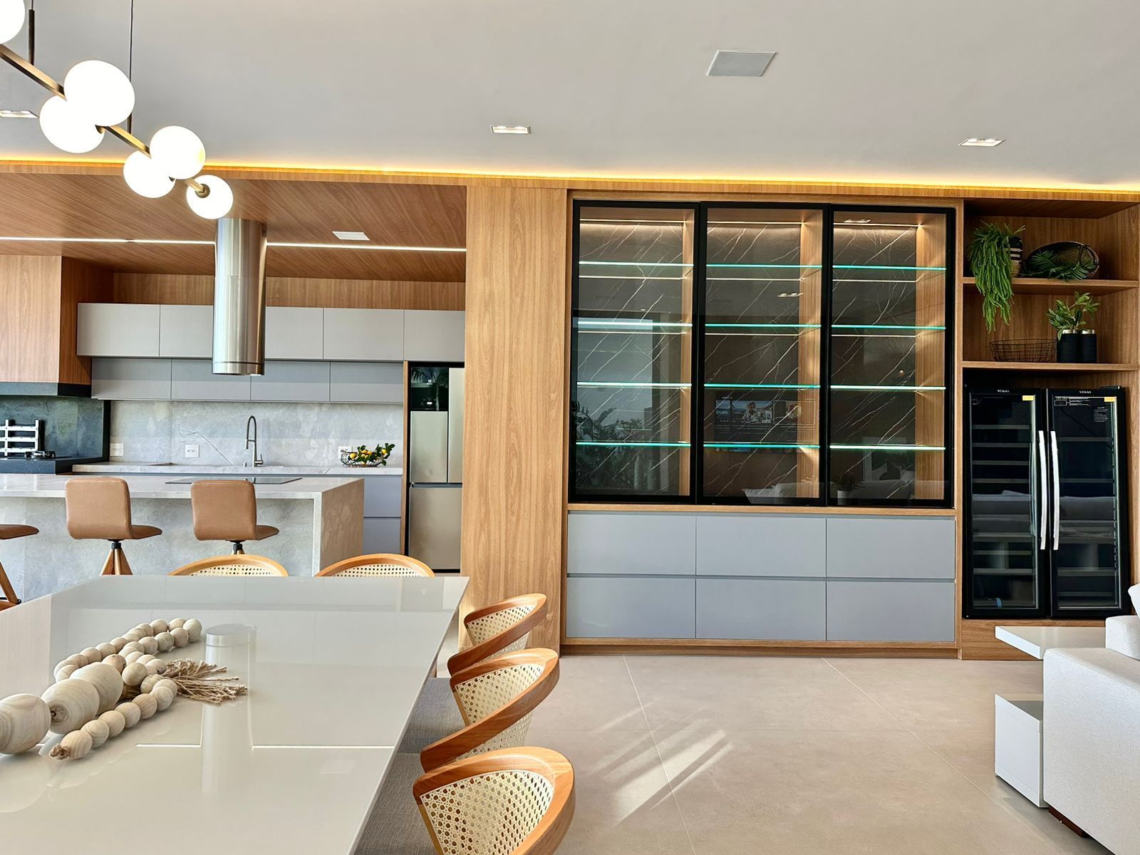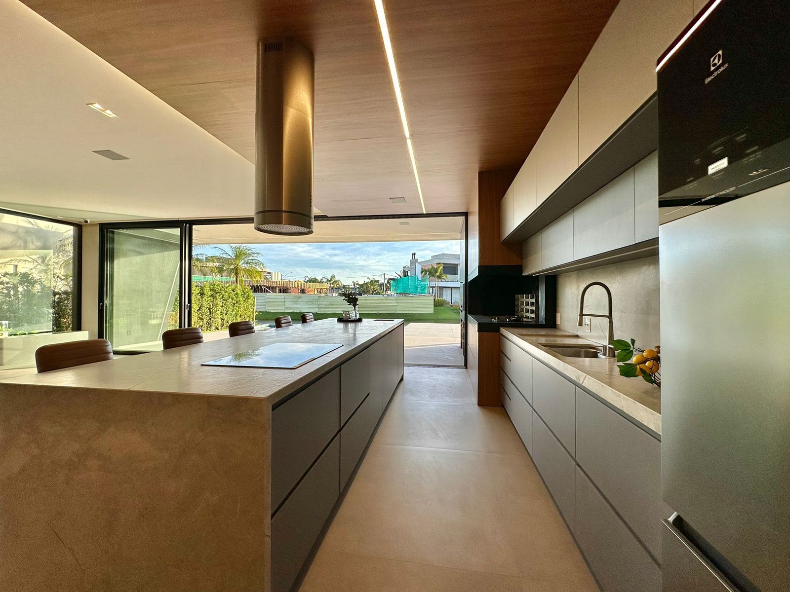 SOBRADO À VENDA BEIRA LAGO ——— Sobrado com 467 M² Lote com M² 06 Suítes sendo 01 térrea Lavabo Beira Lago Piscina de concreto Deck junto ao lago Automatizado Mobiliado Muita Iluminação natural Lareira Churrasqueira Living integrado Aberturas em PVC Piso Aquecido nos Banheiros