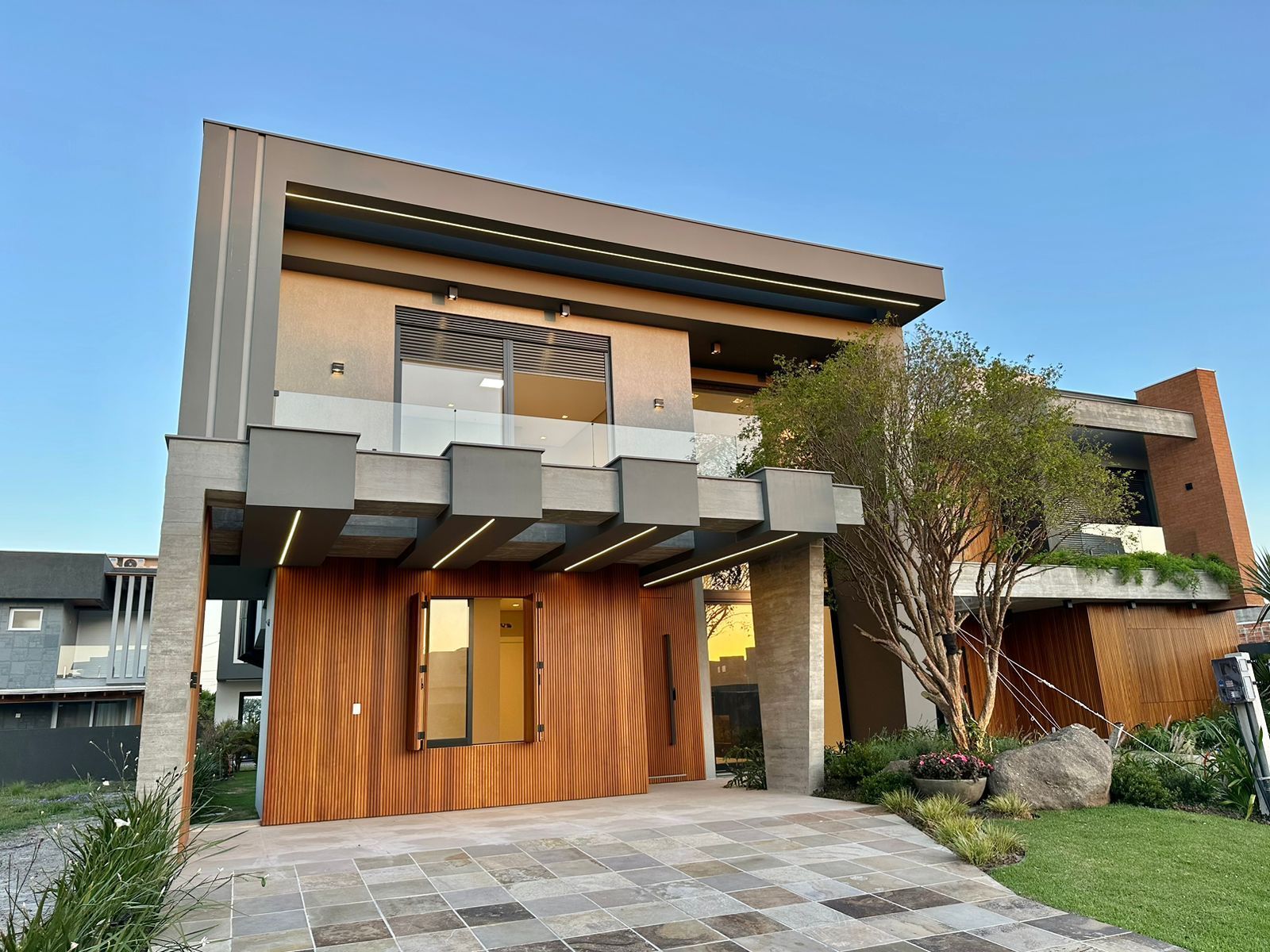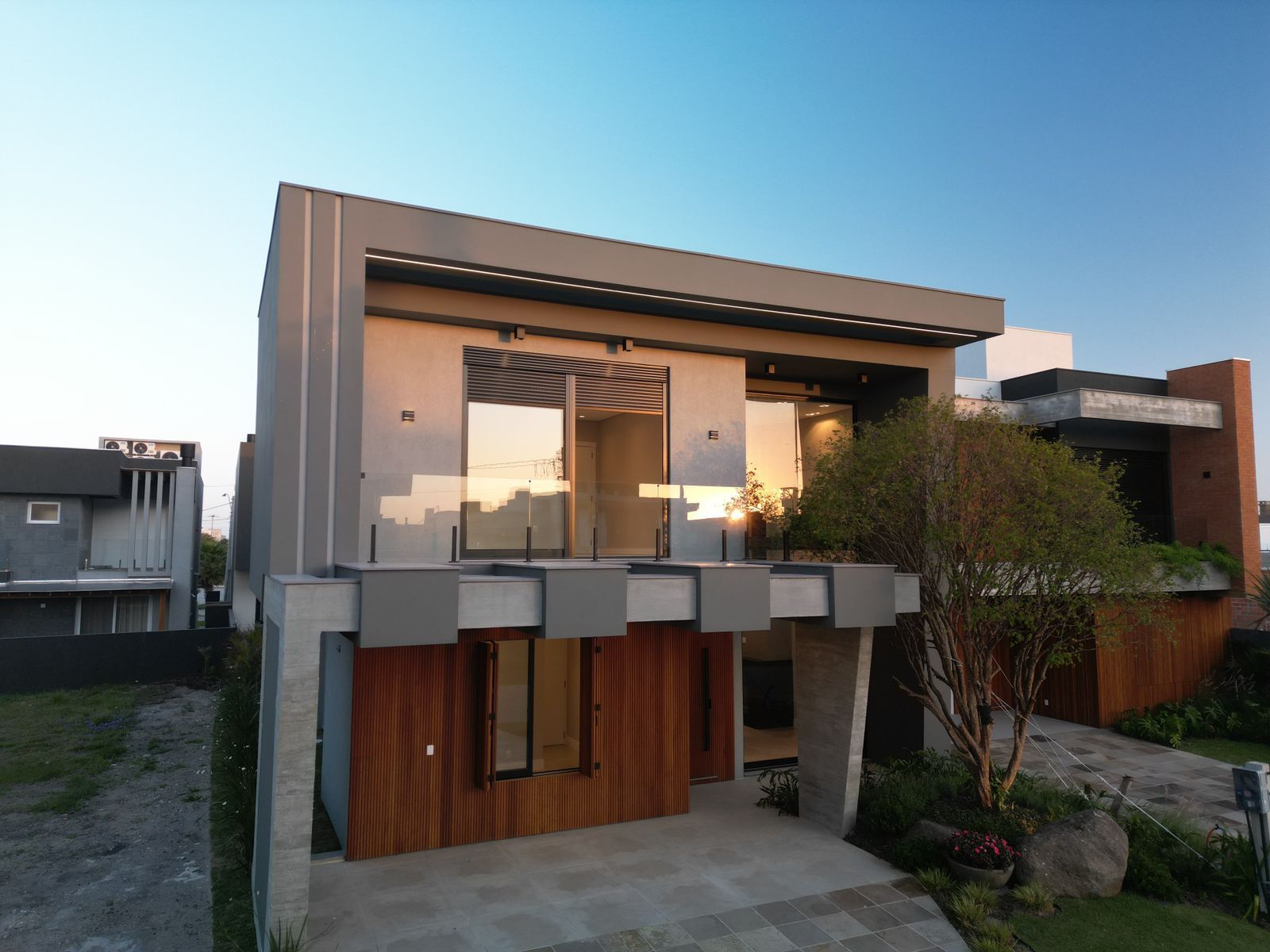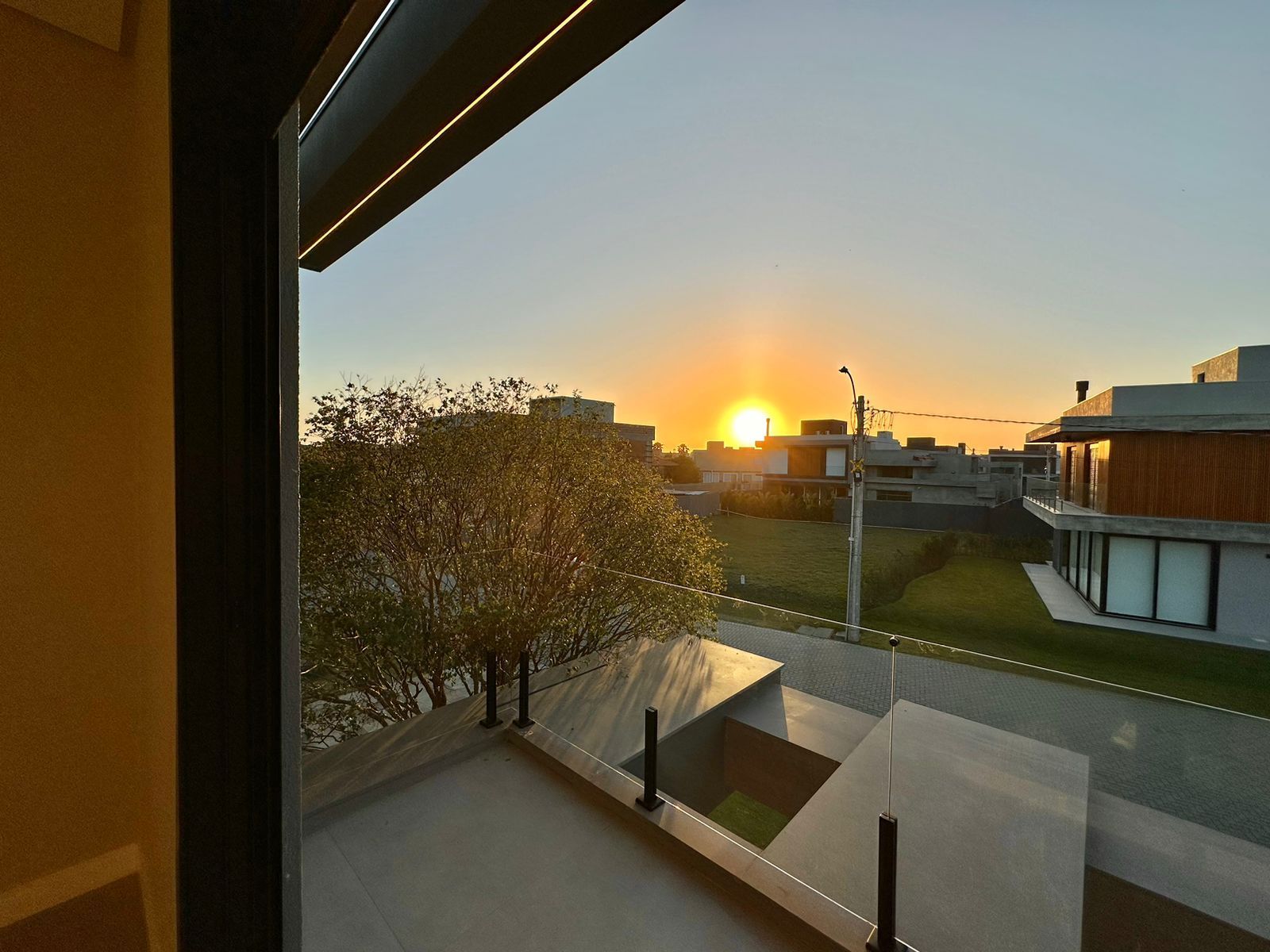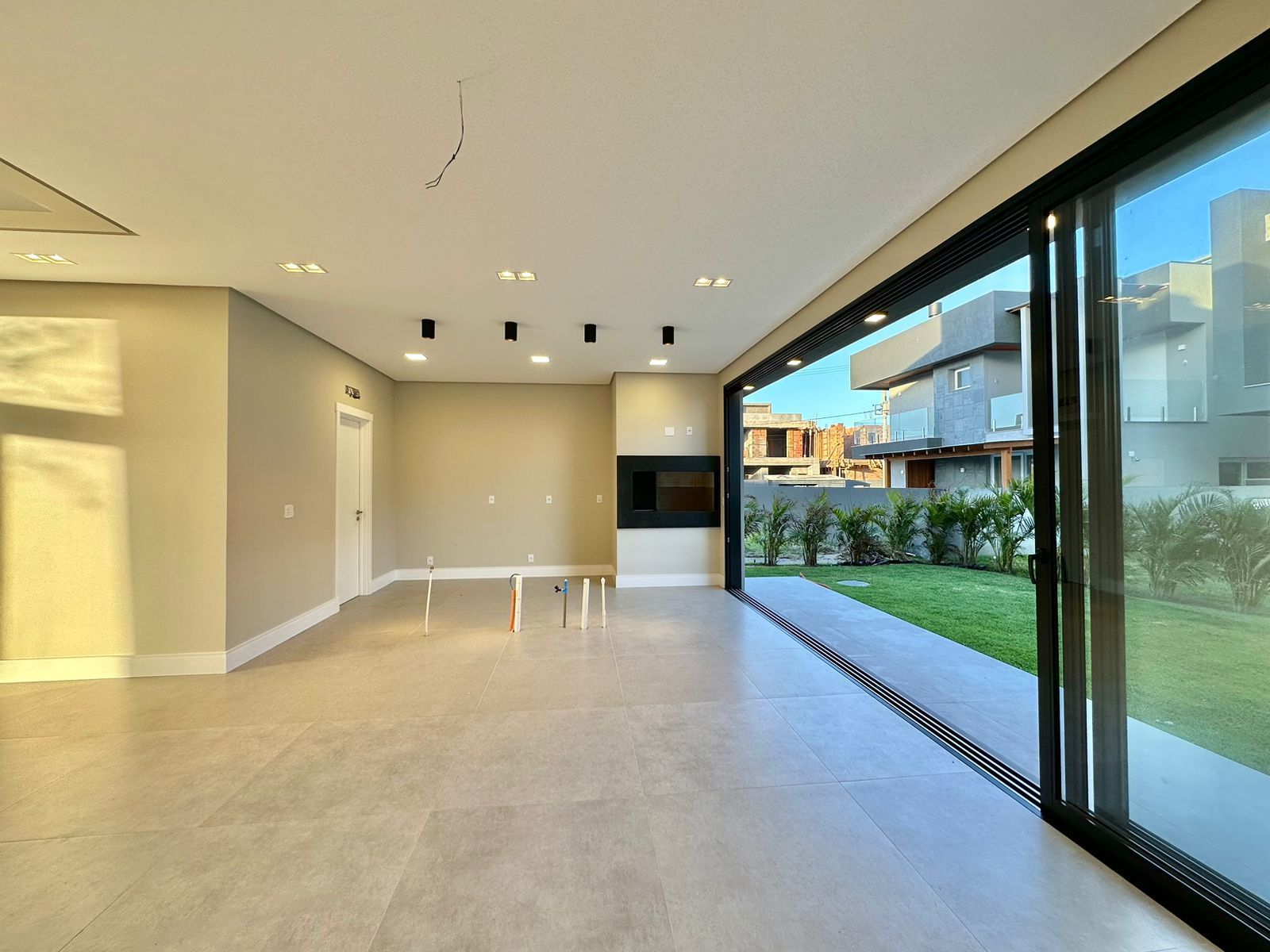 SOBRADO À VENDA! CONDOMÍNIO ——— Sobrado com 260 M² Lote com 260 M² 04 Suítes ( 01 térrea ) Lavabo Paisagismo Living integrado Aberturas Externas em Alumínio preto Persianas automatizadas Lareira Pé direito duplo Nova, nunca usada